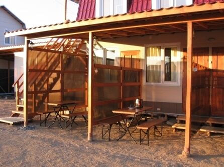 Удобный трехместный номер в деревянном летнем домике с телевизором и кухней.