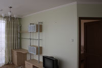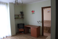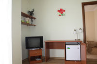 Трехместный номер. Укомплектован одной двуспальной и одной односпальной кроватями, письменным столом, стулом, двумя тумбочками, креслом, телевизором, холодильником, чайником и набором чайной посуды, сейфом, прихожей, шкафом-купе и зеркалом. Без балкона.