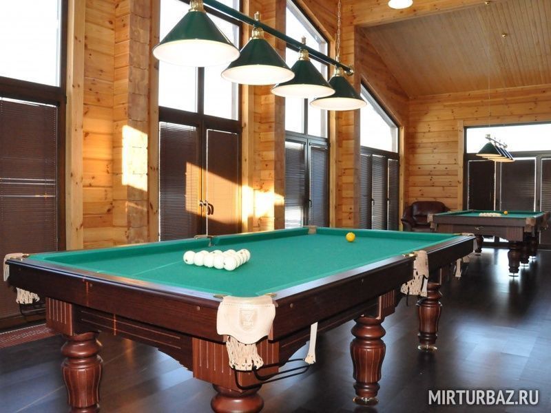 Просторная сауна и купель, две раздевалки и душевые комнаты, комната для отдыха с чайными приборами, бильярдная на два стола с панорамным остеклением.