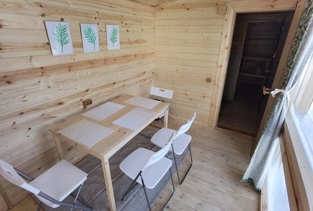 Баня с панорамным окном в комнате отдыха, где можно посидеть за столом. В бане есть душ. Вы можете приобрести ароматные веники, аромамасла и дополнительные дрова на месте.