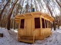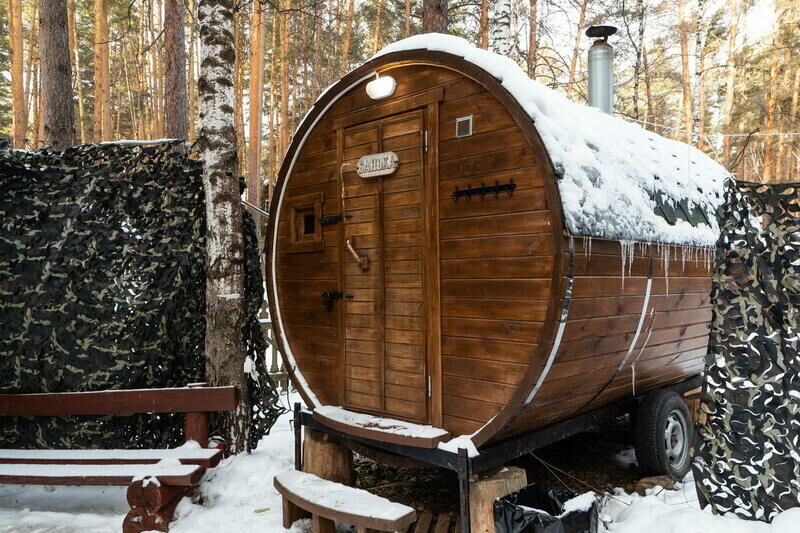 Бочка на одного человека, хороша тем, что тело находится внутри бочки и голова не перегревается. Рекомендуется посещение в 2-3 захода по 10-15 минут, но не более 30 минут. Добавляются эфирные масла, которые приятно пахнут и хорошо впитываются организмом.