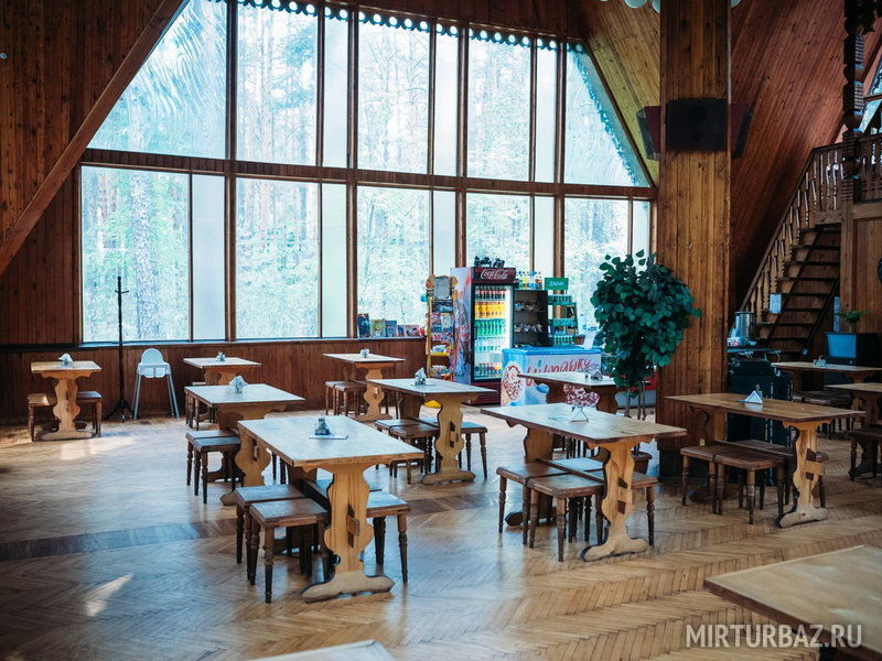 База отдыха «Русь» предлагает 3-х разовое питание в обеденном зале с панорамными окнами. Вкусное питание с утра и до вечера! Зал рассчитан на 80 человек. А также в столовой можно приобрести продукты питания по доступным ценам: замаринованное мясо для шашлыка, овощи, напитки, чипсы, шоколад, мороженое и другие продукты.