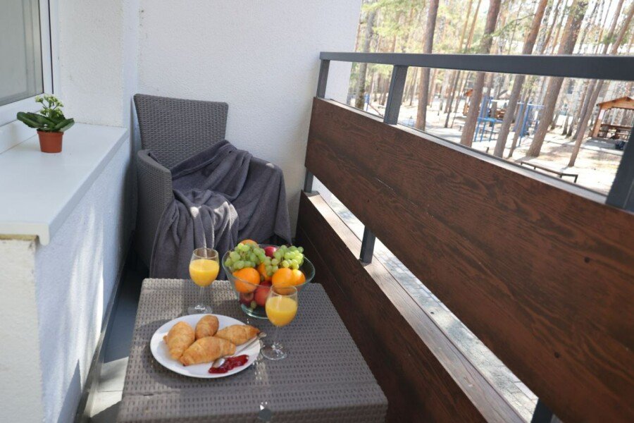 Студия + спальня. Апартаменты оборудованы техникой и всем необходимым для комфортного проживания. Теплые полы, СВЧ-печь, тостер и фильтр для воды станут приятным бонусом. 2 балкона с видом на лес подарят утренний аромат соснового леса и возможность побыть в тишине. Паркинг и мангальные беседки бесплатно.
