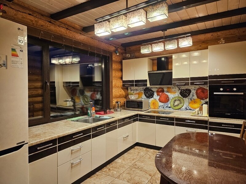 Имеется кухня. Там есть большой двухкамерный холодильник, духовая и микроволновая печи, с варочной панелью. К услугам гостей «Терема» также посудомоечная машина и удобный кухонный гарнитур с широкой столешницей. Есть необходимая посуда (кастрюли, сковородки) и комплект столовых приборов на 16 человек.