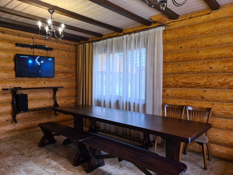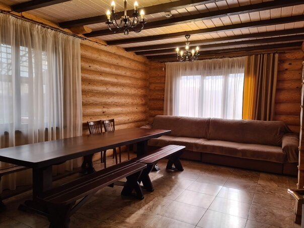 Просторная, светлая и уютная гостиная, расположенная на первом этаже. Там есть большой настенный плазменный телевизор, раскладной стол и удобный модульный диван.