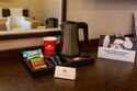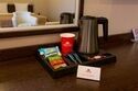 В номере чисто, уютно, тепло, есть фен, телевизор, чайник, набор посуды, набор для приготовления чая и кофе, бутилированная вода и даже пара вафелек на угощение.