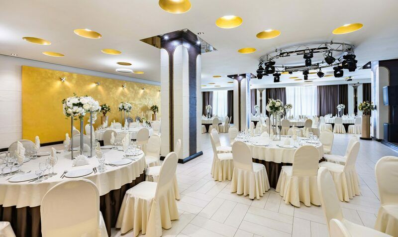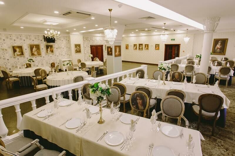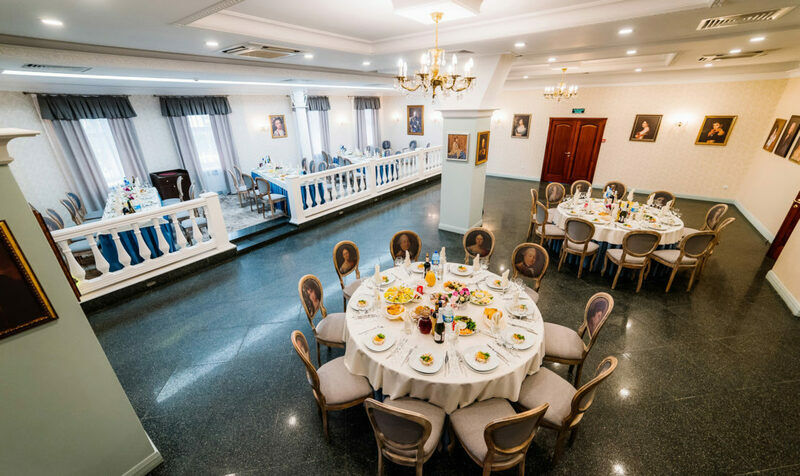 Просторный банкетный зал «Империя» в классическом стиле подойдет для проведения свадьбы, юбилея или корпоративного мероприятия с большим количеством гостей выполнен в классическом стиле.