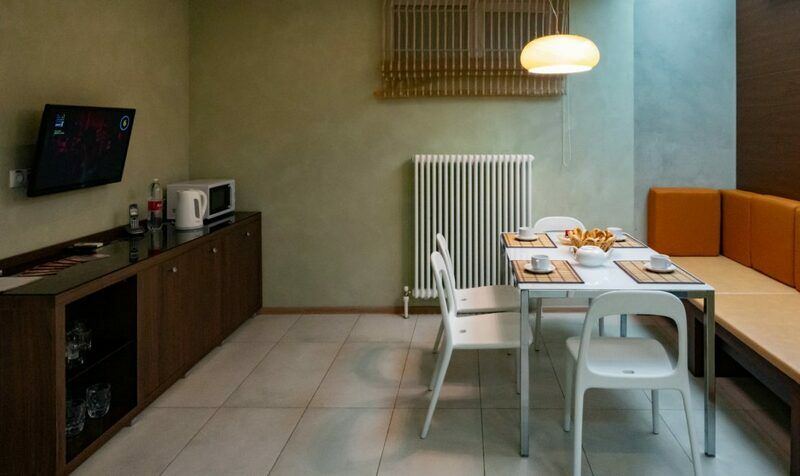 Возможна организация питания: фуршетов, кофе-брейков, деловых обедов и праздничных банкетов – по договоренности.Вместимость – 20 чел.