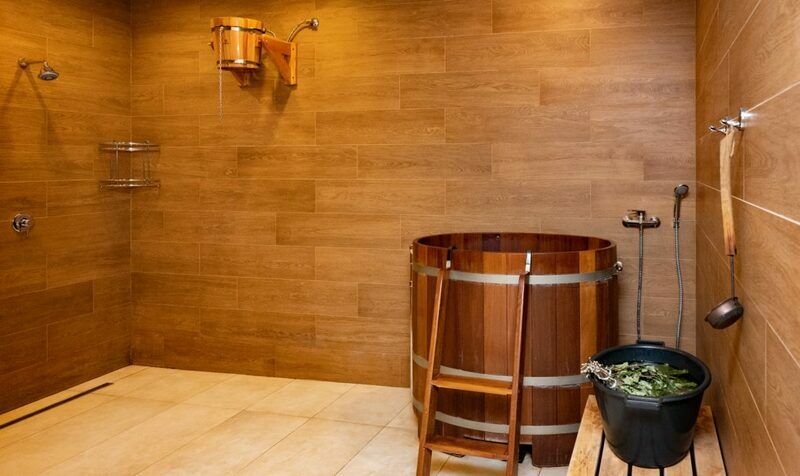 Сауна оборудована печкой-каменкой, имеется деревянная купель, обливная кадушка и просторная комната для отдыха.
