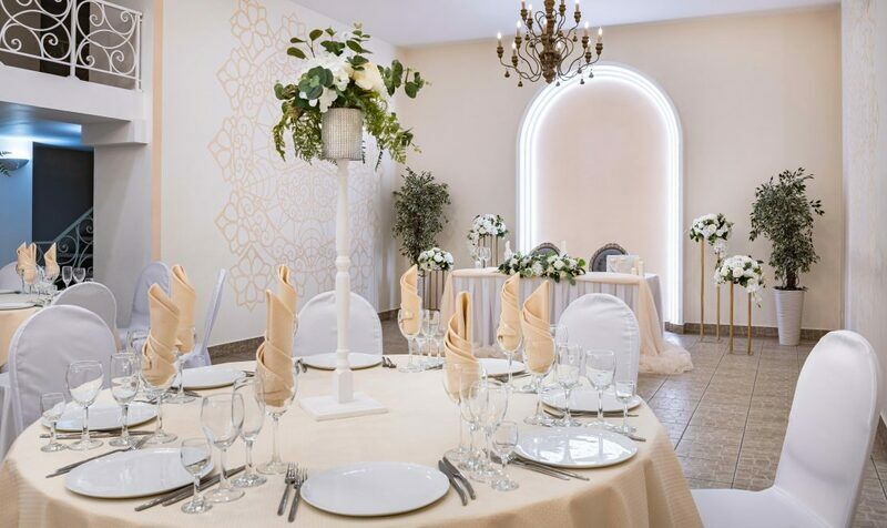 Для свадебных церемоний имеется закрытый летний дворик. В центре банкетного зала — широкий удобный танцпол. В стоимость услуг включено профессиональное звуковое и световое оборудование.