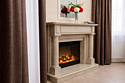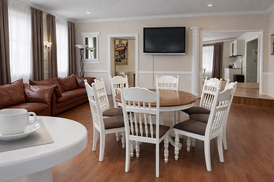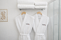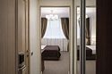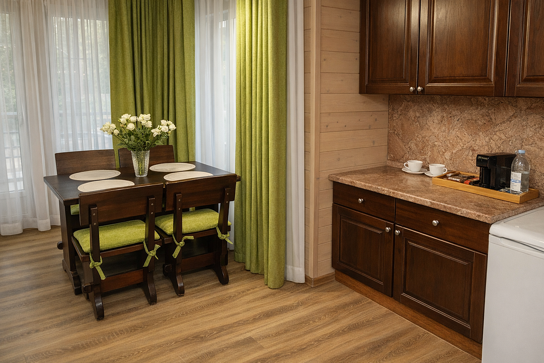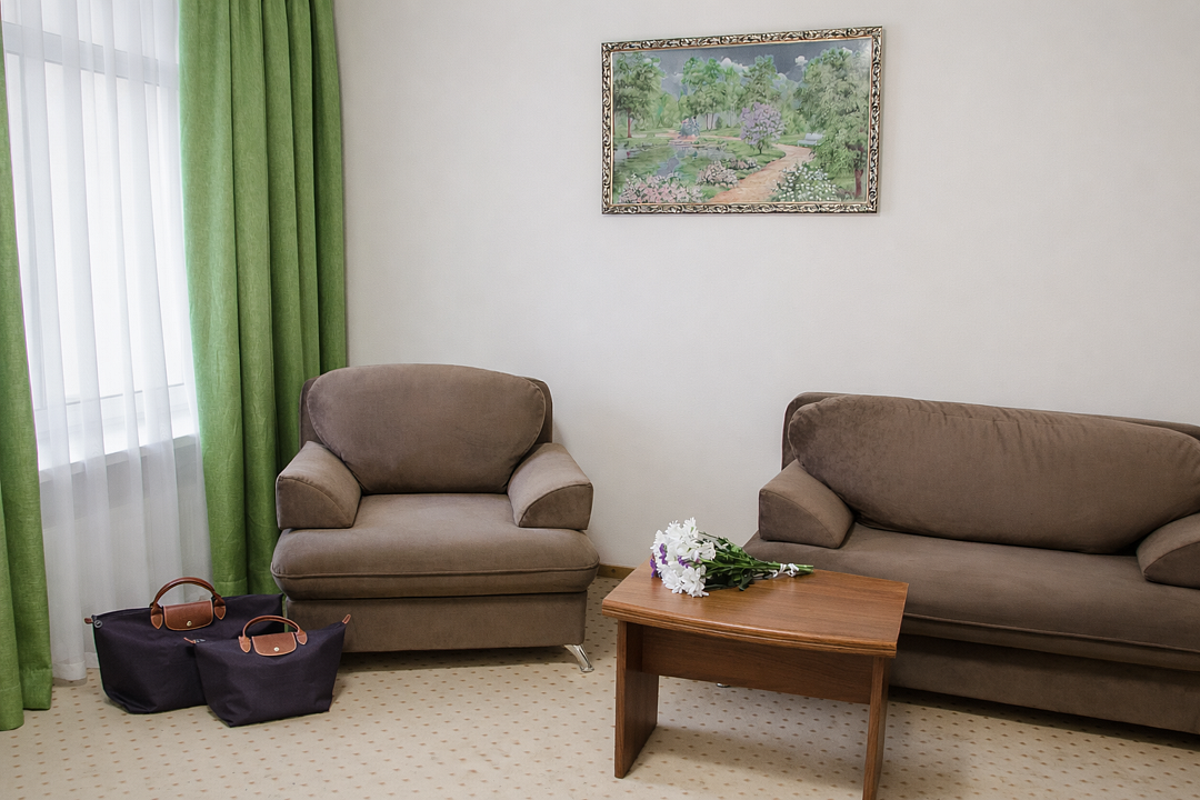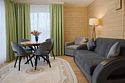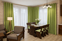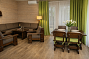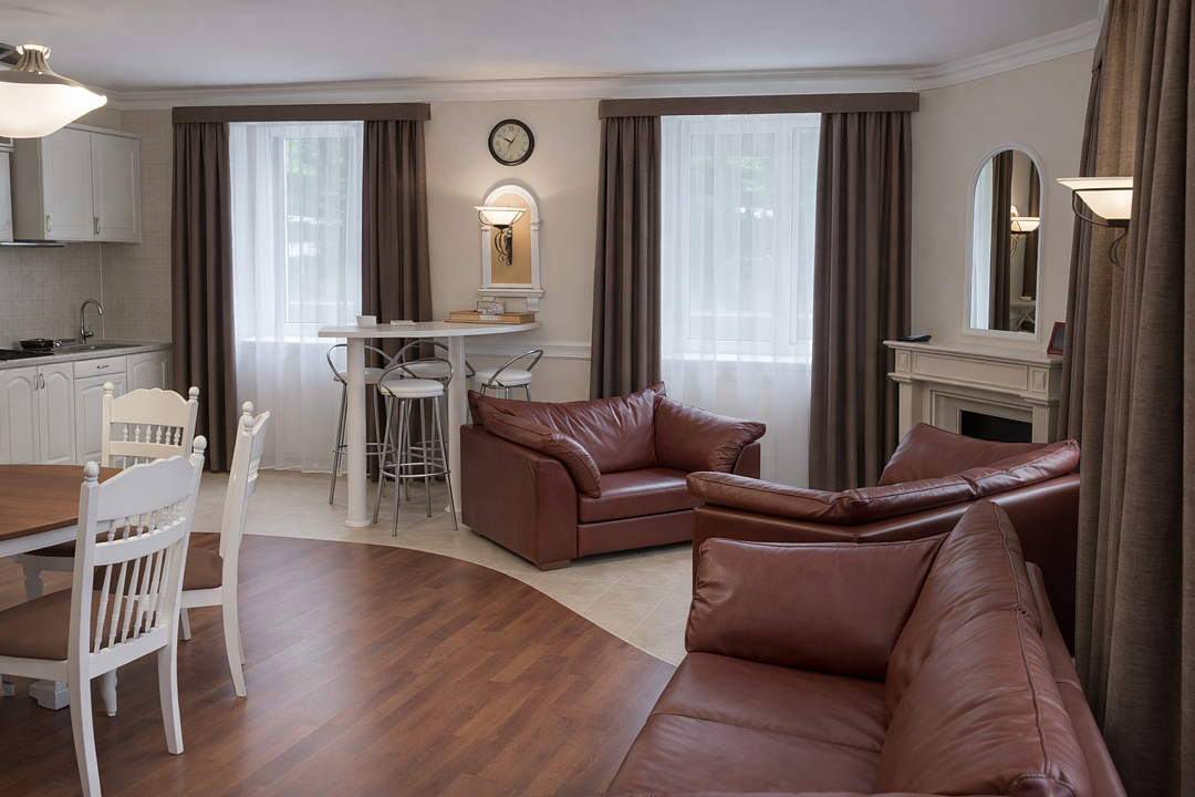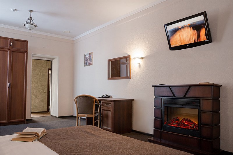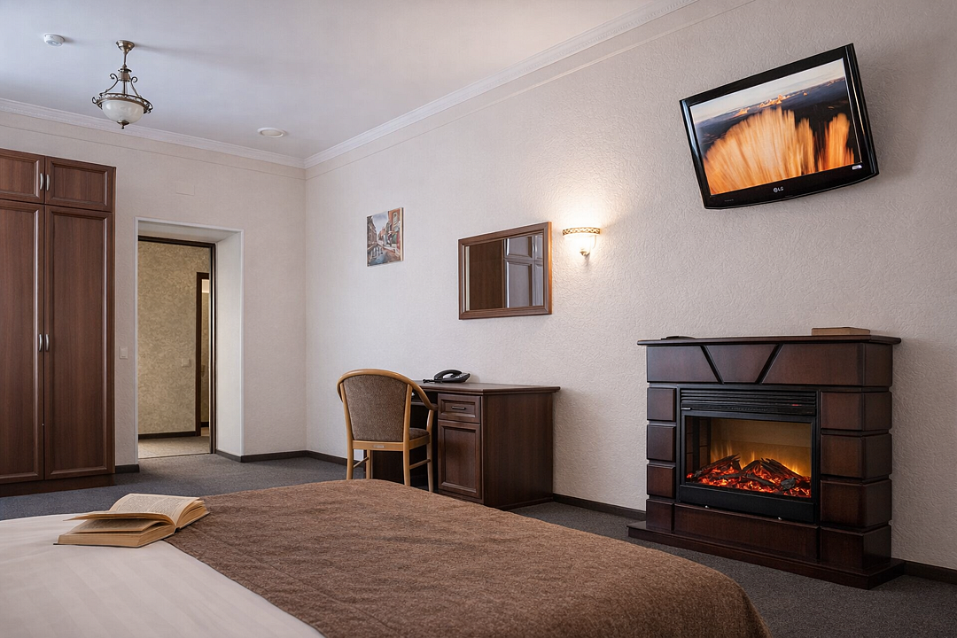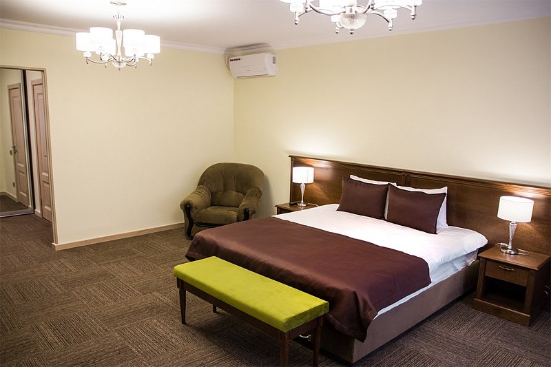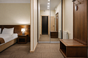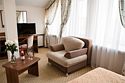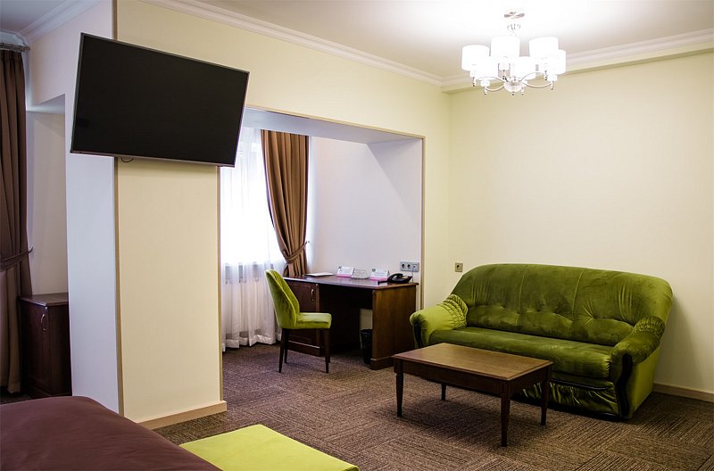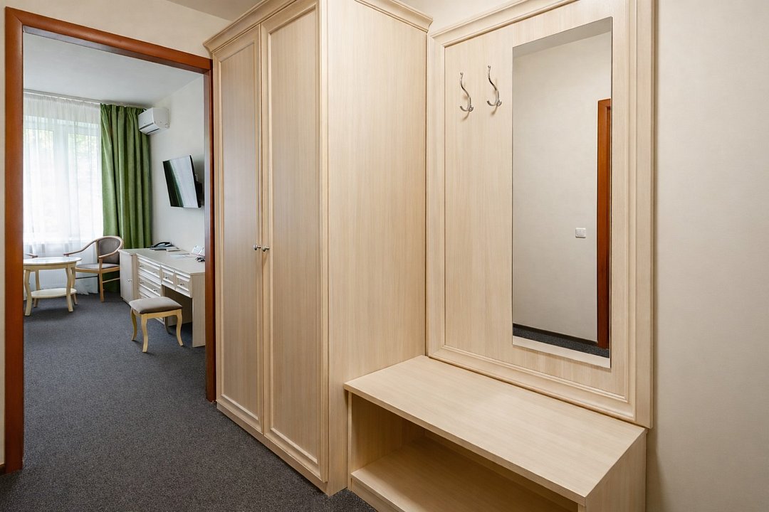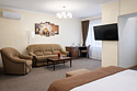 Площадь номеров — 41—60 м2 В прихожей: платяной шкаф, вешалка, зеркало. В зоне гостиной: рабочий стол, мягкая мебель (диван, кресла), торшер, мини-бар. В спальной зоне: двуспальная кровать, 2 прикроватные тумбочки, туалетный столик, полу-кресла, шкаф, телефон, телевизор. В ванной комнате: душевая кабина, ванна, фен, туалетные принадлежности (шампунь, жидкое мыло), комплект полотенец.