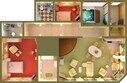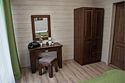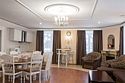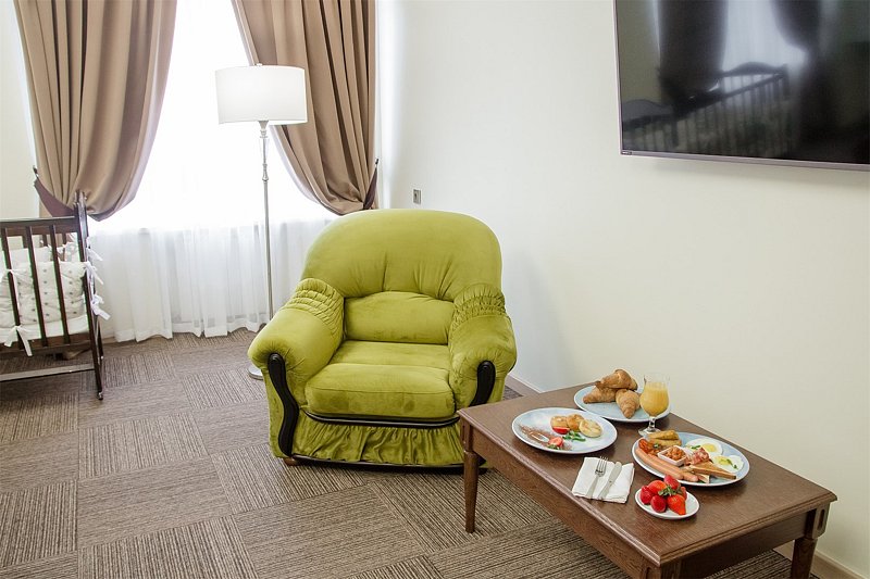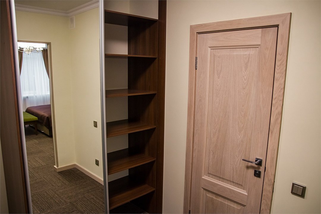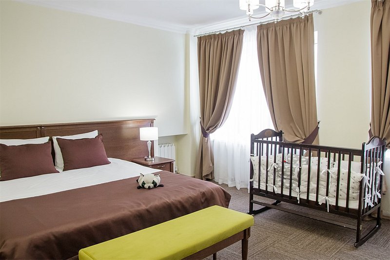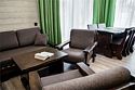 В прихожей: платяной шкаф, вешалка, зеркало. В гостиной: рабочий стол, диван, кресла, журнальный столик, торшер, мини-бар. В спальной комнате: двуспальная кровать (или две односпальные кровати), 2 прикроватные тумбочки, туалетный столик с зеркалом и полукресло, платяной шкаф. В каждой комнате телефон, телевизор. В ванной комнате: душевая кабина, фен, туалетные принадлежности (шампунь, жидкое мыло), комплект полотенец. Номер удобен для проживания с детьми и может быть использован на длительное время, возможно размещение до 5 человек.