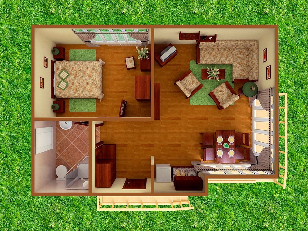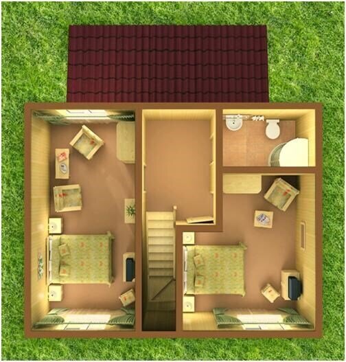 На первом этаже: гостиная, ванная и спальная комнаты.