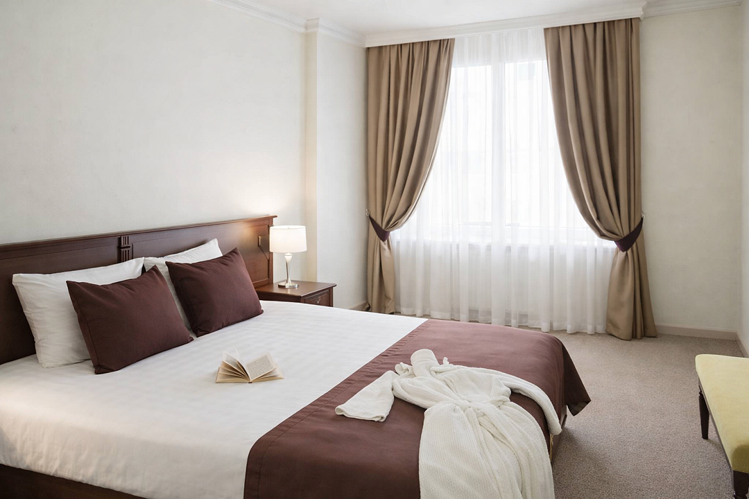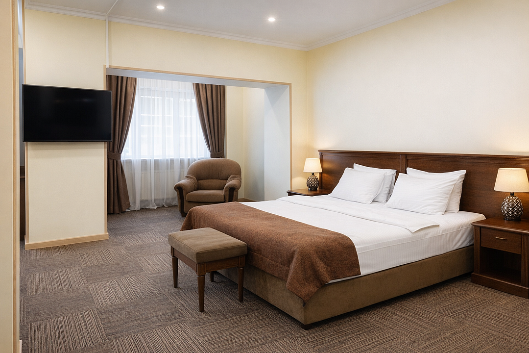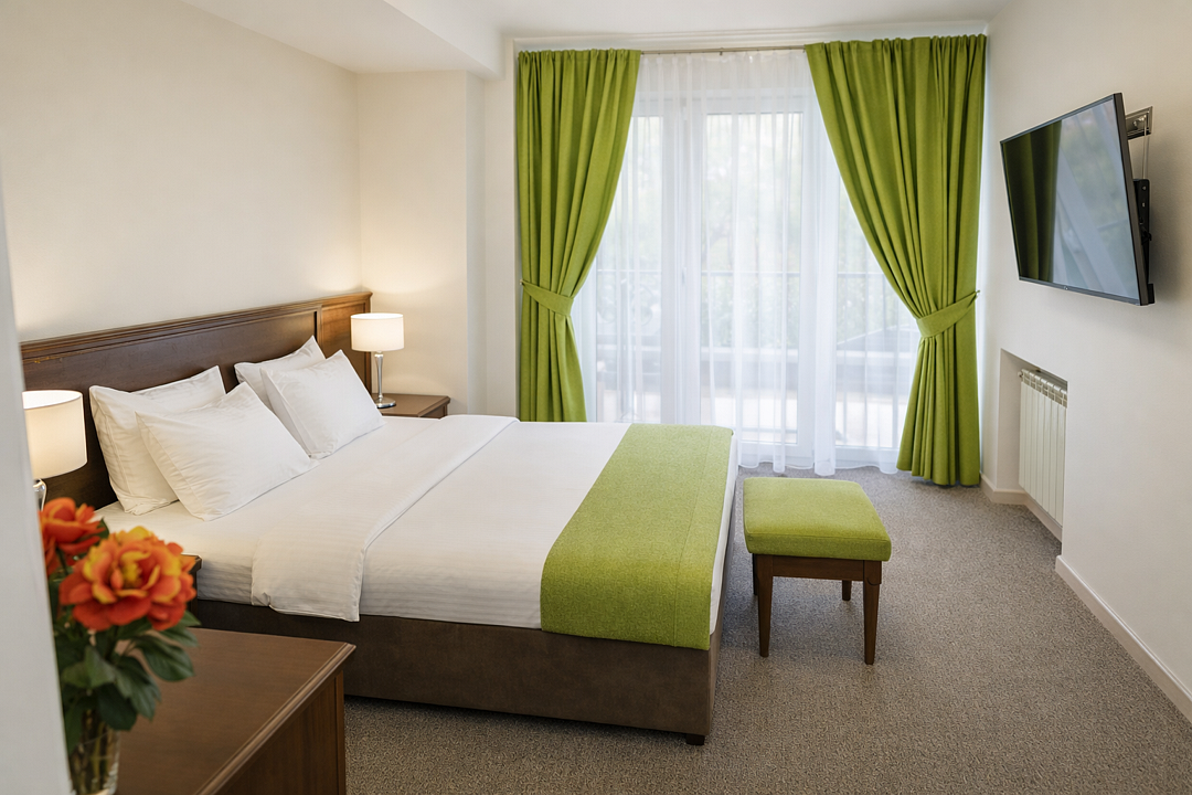 Уютный однокомнатный номер (22-36 кв м) с двуспальной кроватью или с двумя односпальными кроватями. Кондиционер. Номер отличается от Стандартного номера наличием стационарного дополнительного места – кресла-кровати. Размещение 1-3 чел.