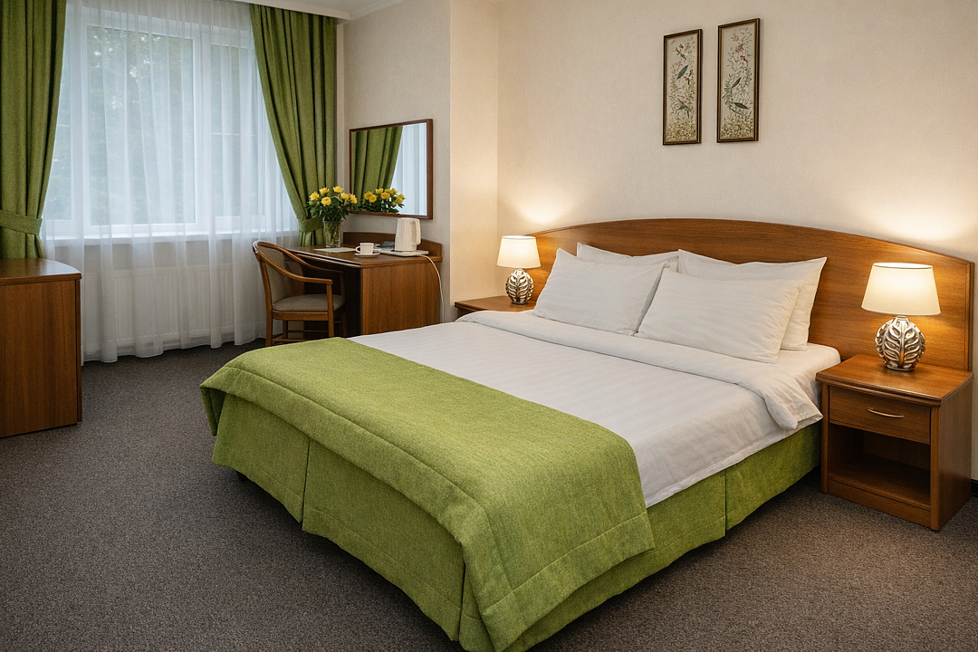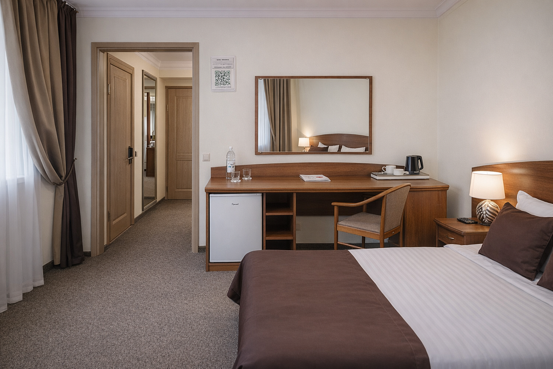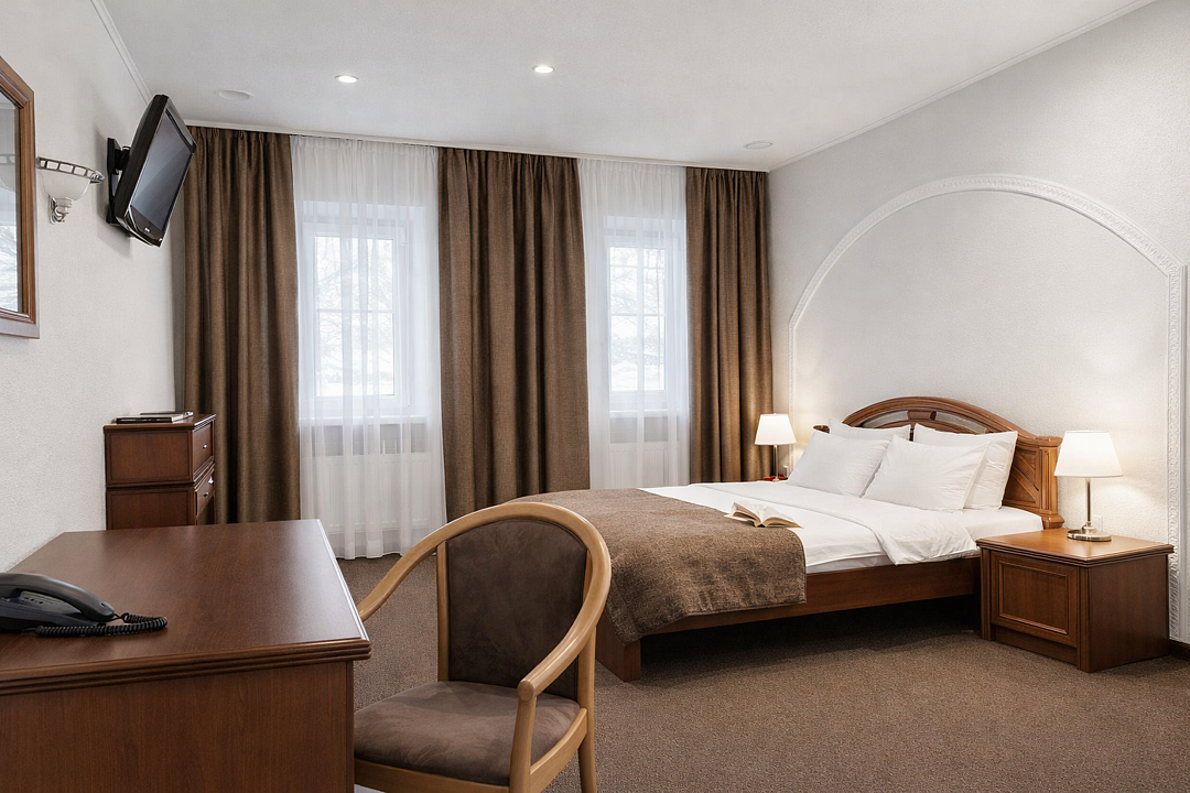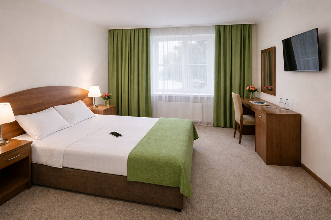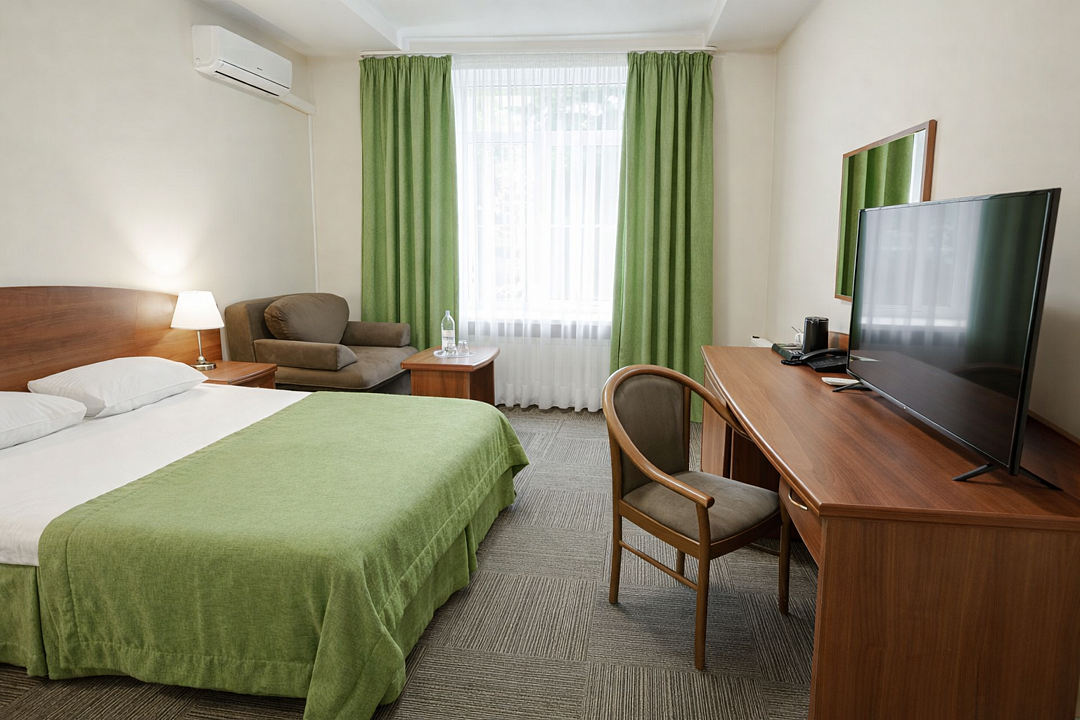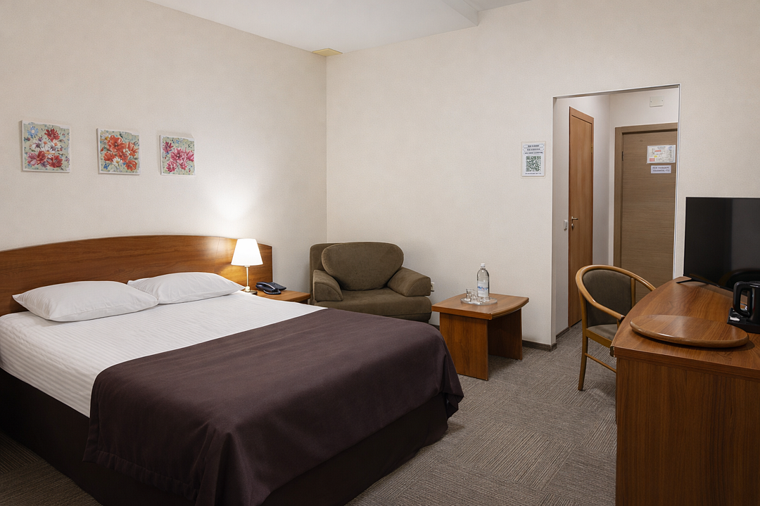 Площадь номера от 18 до 28 м2. В прихожей: шкаф, вешалка, зеркало. В комнате: туалетный столик с зеркалом, мини-бар, телевизор, телефон, прикроватные тумбочки. Номера с одной двуспальной кроватью или двумя односпальными. В ванной комнате: душевая кабина, фен, туалетные принадлежности (шампунь, жидкое мыло), комплект полотенец. можно с питомцами, собаками небойцовых пород до 40 см в холке (за дополнительную плату).
