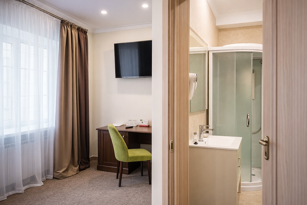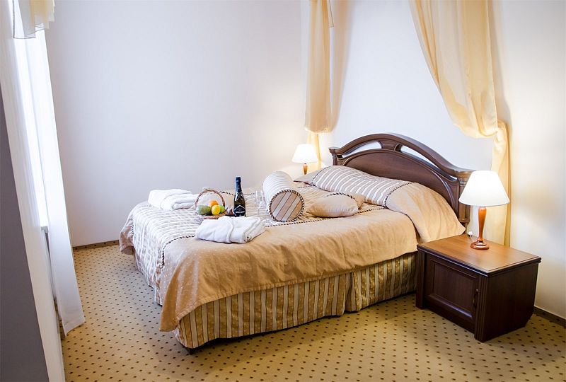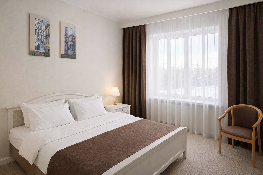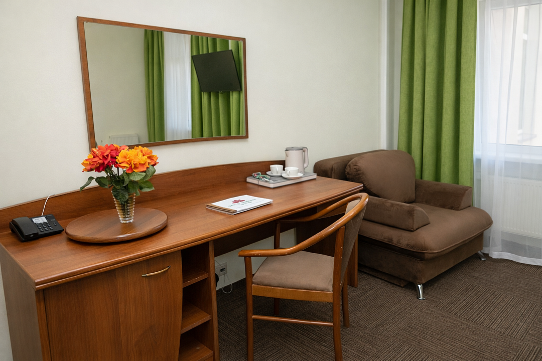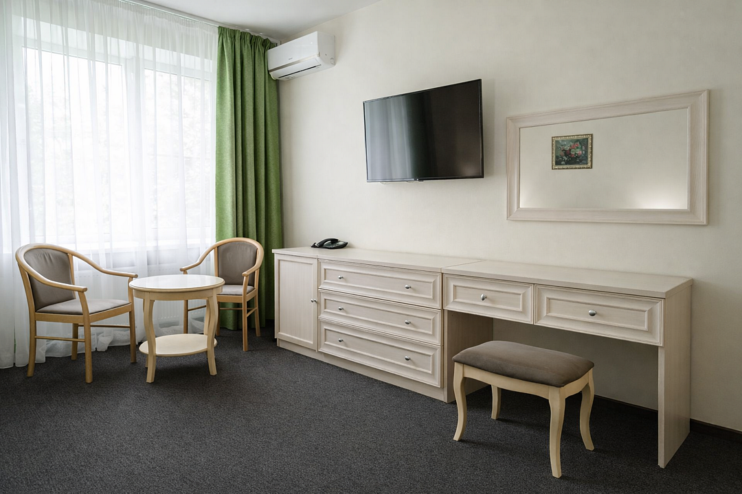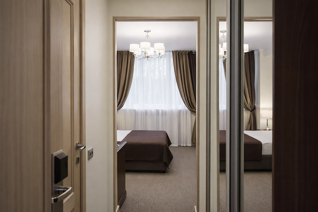 Площадь номера от 18 до 28 м2. В прихожей: шкаф, вешалка, зеркало. В комнате: туалетный столик с зеркалом, мини-бар, телевизор, телефон, прикроватные тумбочки. Номера с одной двуспальной кроватью или двумя односпальными. В ванной комнате: душевая кабина, фен, туалетные принадлежности (шампунь, жидкое мыло), комплект полотенец. можно с питомцами, собаками небойцовых пород до 40 см в холке (за дополнительную плату).