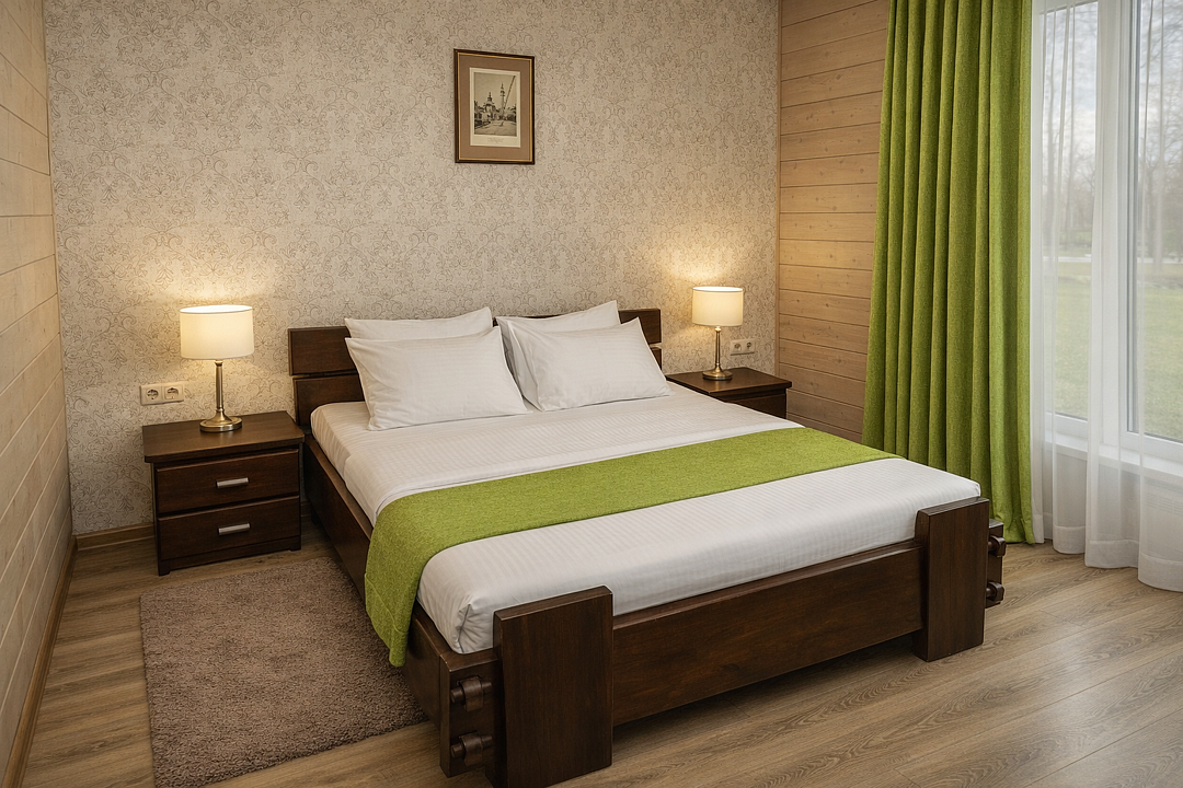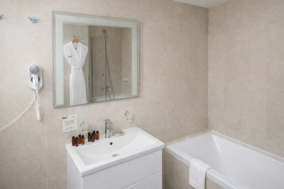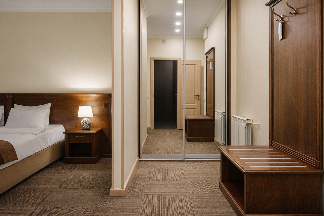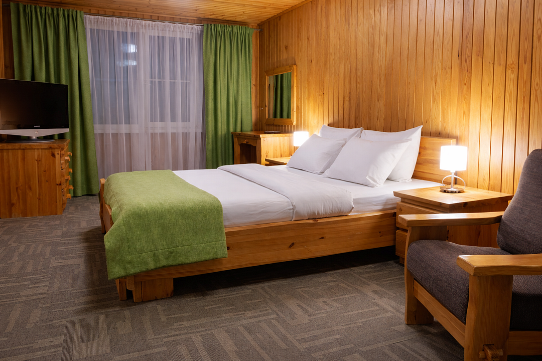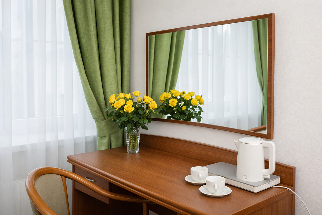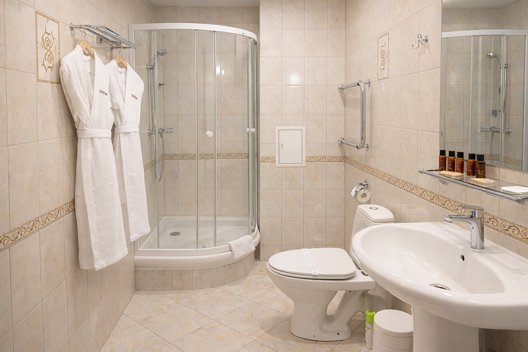 Площадь номера от 18 до 28 м2. В прихожей: шкаф, вешалка, зеркало. В комнате: туалетный столик с зеркалом, мини-бар, телевизор, телефон, прикроватные тумбочки. Номера с одной двуспальной кроватью или двумя односпальными. В ванной комнате: душевая кабина, фен, туалетные принадлежности (шампунь, жидкое мыло), комплект полотенец. можно с питомцами, собаками небойцовых пород до 40 см в холке (за дополнительную плату).