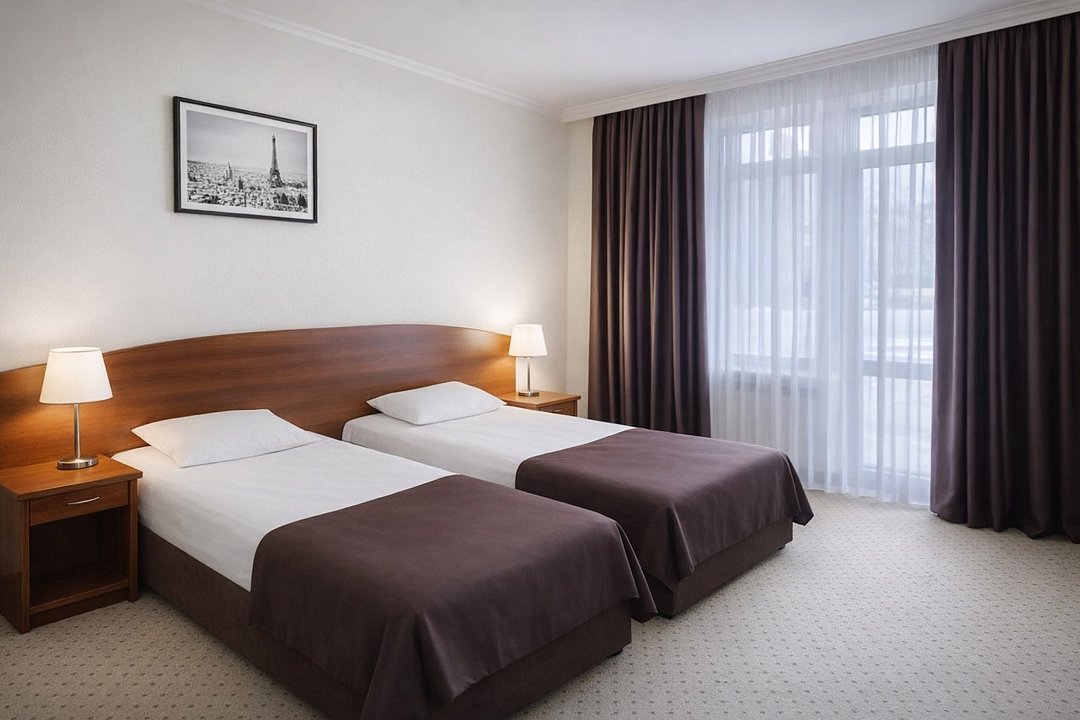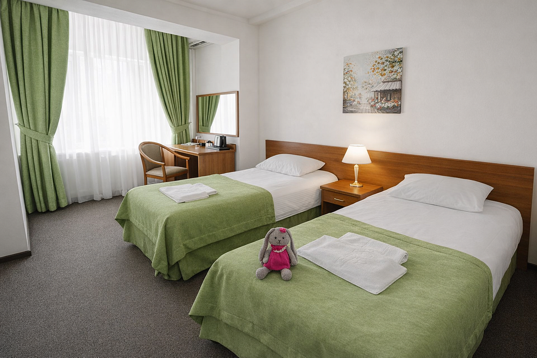 Уютный номер для двухместного размещения с двумя односпальными кроватями.