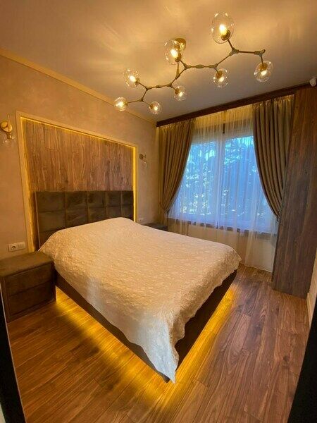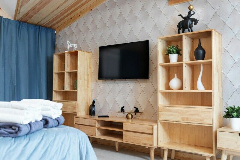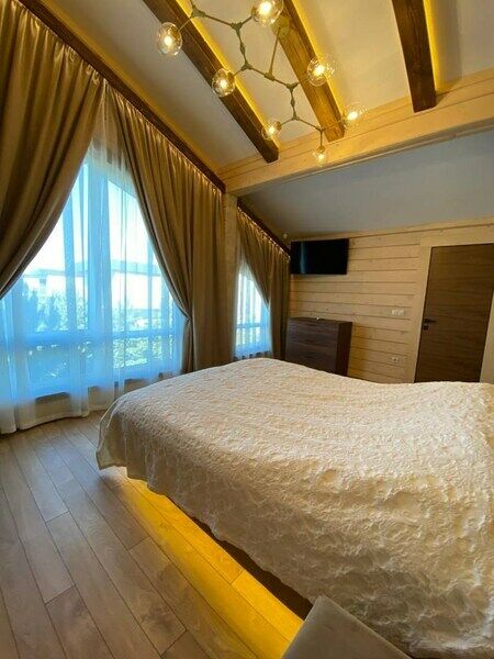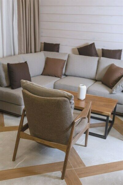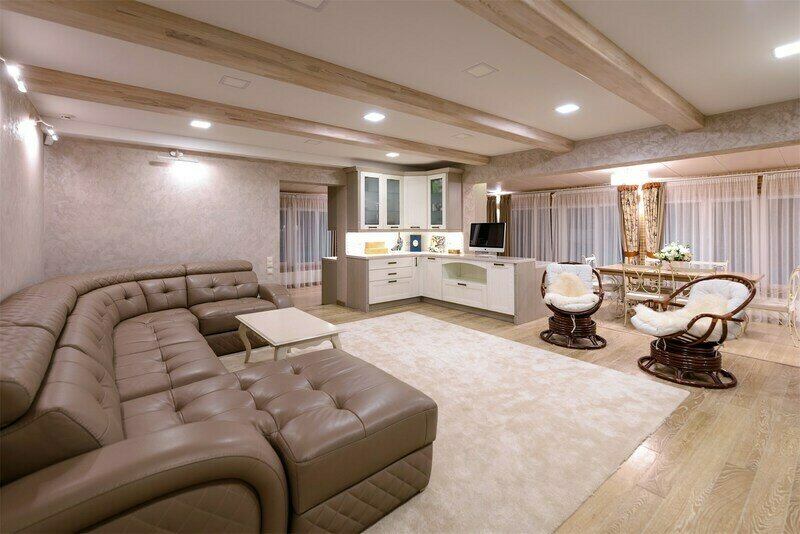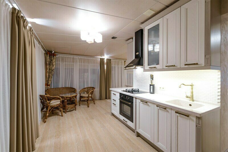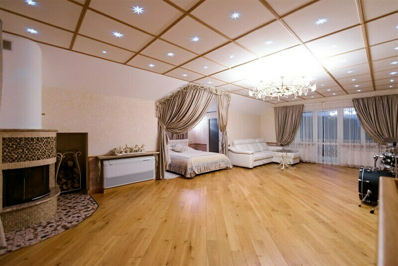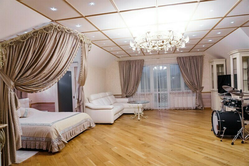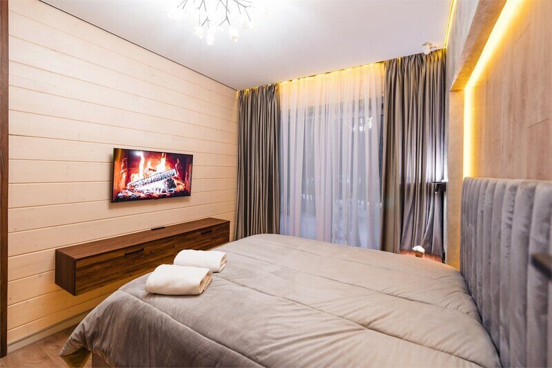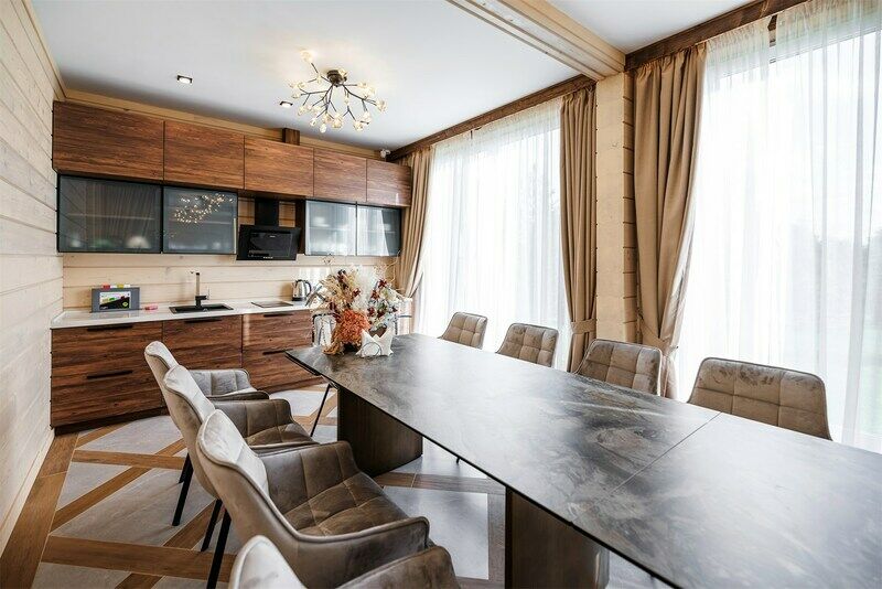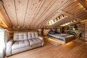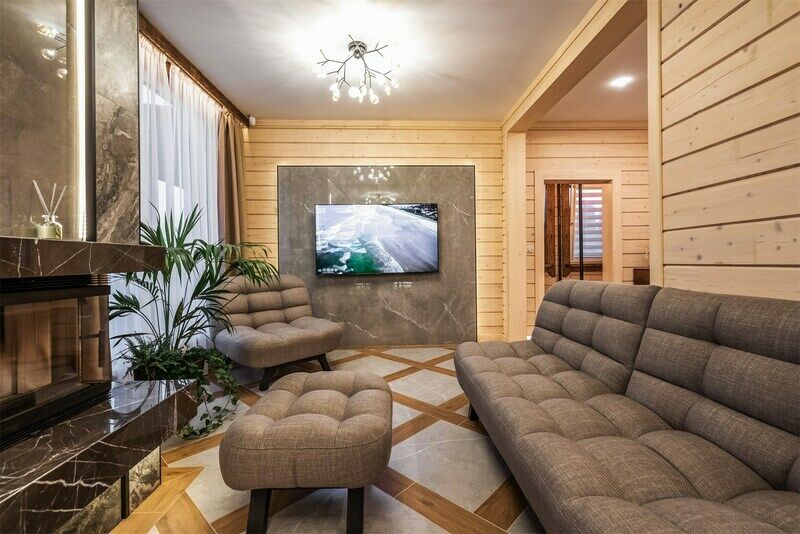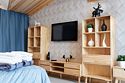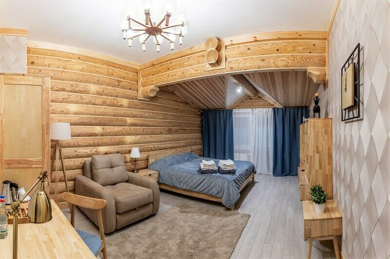 В коттедже клуба есть просторная гостиная с камином, барной зоной, мягкой мебелью и множеством оригинальных деталей в интерьере. Кухня оборудована всей необходимой бытовой техникой, а в двух уютных спальнях с комфортом могут разместиться сразу несколько семей. В гостиной диван также раскладывается, трансформируясь в 2 полноценных спальных места.