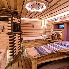 - баня «3 медведя» (малая): вместимость 5 человек, парные и аква–зона, стоимость — 7500 ₽/час.