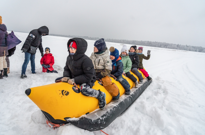 В зимнюю пору вы можете покататься на коньках, ледяной горке, надувном банане или снегоходах. А после угоститься ароматным чаем со сладостями. Также рядом с клубом проложена лыжная трасса.