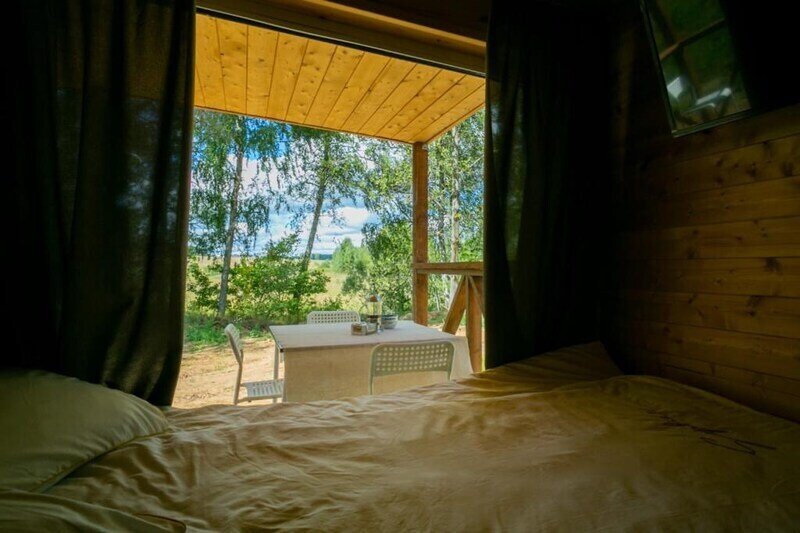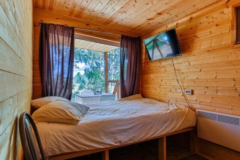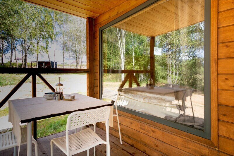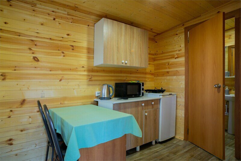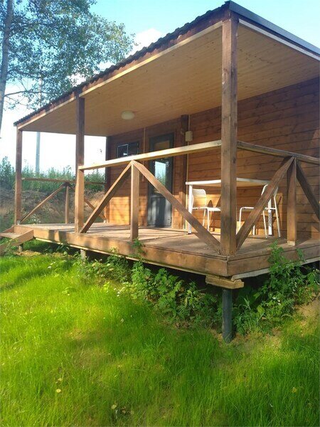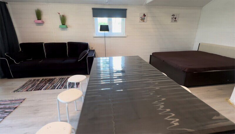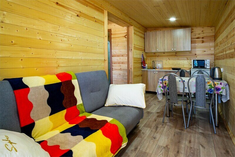 Дом № 6 площадью 40 кв.м, где комфортно разместиться 4 взрослых человека, а также есть мансардный этаж с матрасами, где могут разместиться ещё 2 взрослых человека или трое детей.