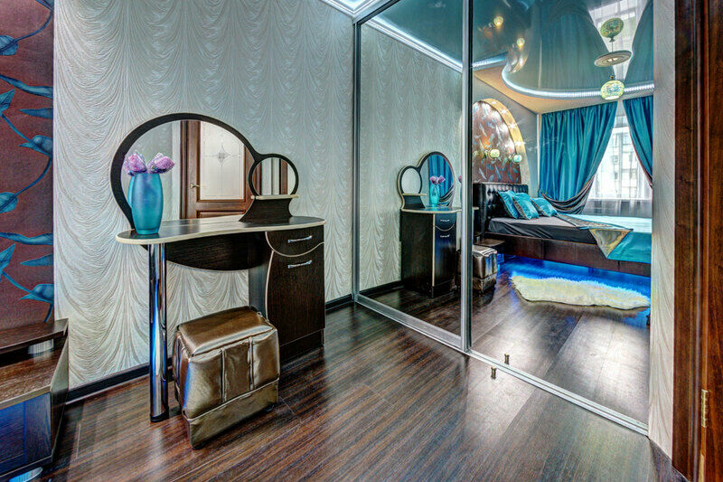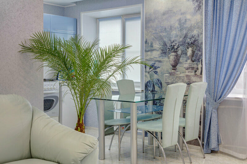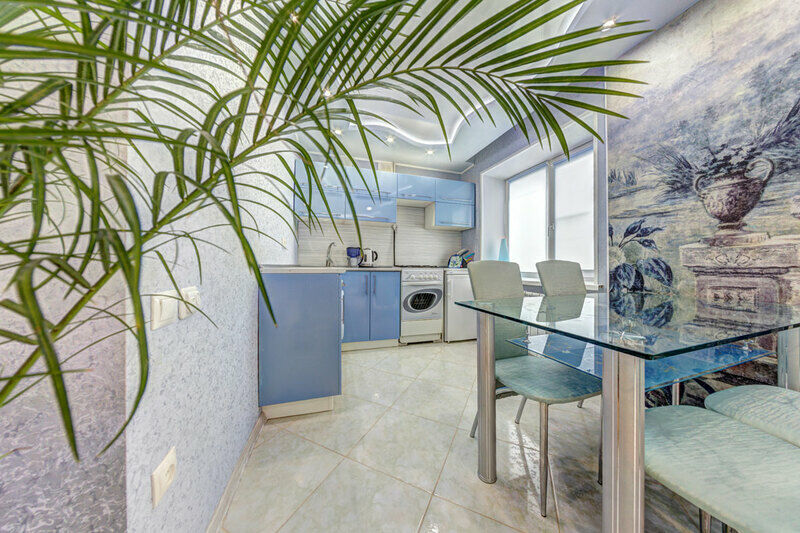 В квартире воплощена авторская планировка пространства, продуманного до мелочей. Зал и кухонная зона объединены в просторный холл, получивший оригинальное цветовое решение в светло-голубых тонах. В свою очередь спальня, отделанная в классическом стиле, радует глаз изысканностью гармонии шоколадного и бирюзового цветов.