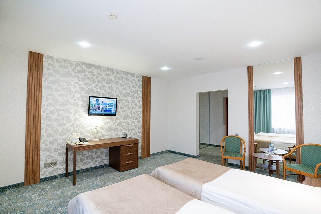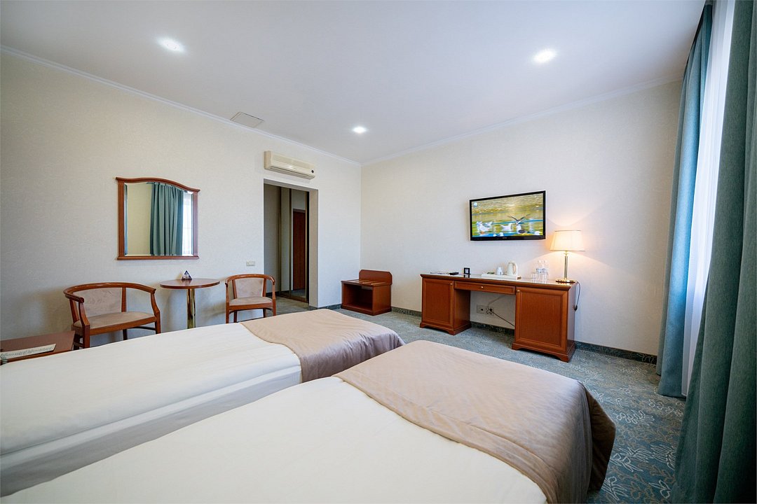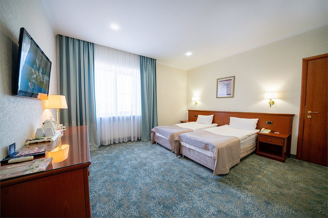 телевизор, кабельное телевидение, Wi-Fi, телефон, кондиционер, светильник, настольные лампы, фен, электронные замки, утюг, ванная комната, ванна, банные принадлежности, халаты, банные полотенца, тапочки, гигиенические средства, косметические средства, две полутораспальные кровати, тумбы, стулья, шкаф для одежды, гардеробная, вешалки, журнальный столик, багажная тумба, зеркало, ковер, мини-бар, обслуживание номеров, сейф, минеральная вода, набор для приготовления чая и кофеВ гостиничном номере
