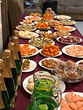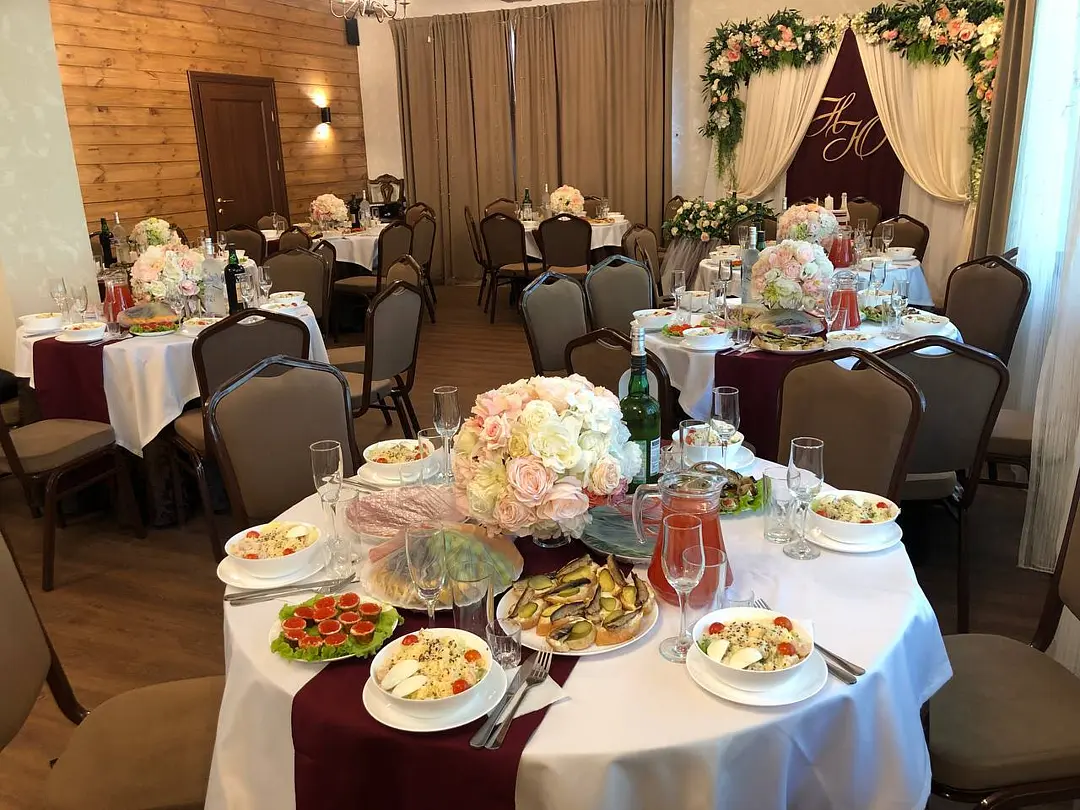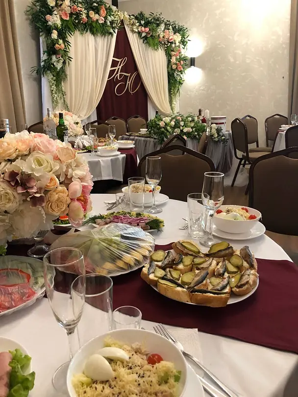Средний чек на банкет от 2500 ₽ на человека (холодные закуски, нарезка, салат порционный, горячее с гарниром).