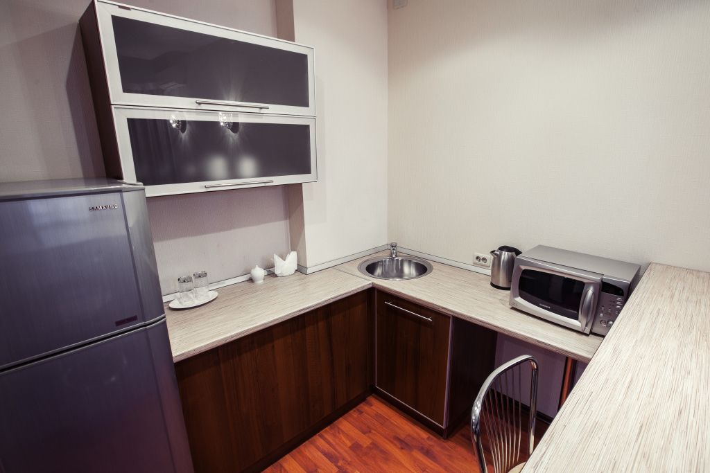 Кухонная зона: Холодильник, чайник, микроволновая печь, набор посуды, барная стойка.
