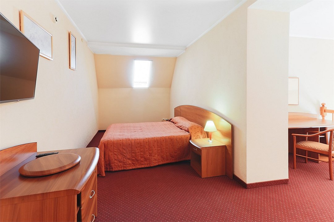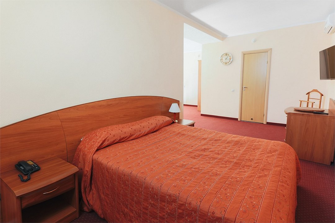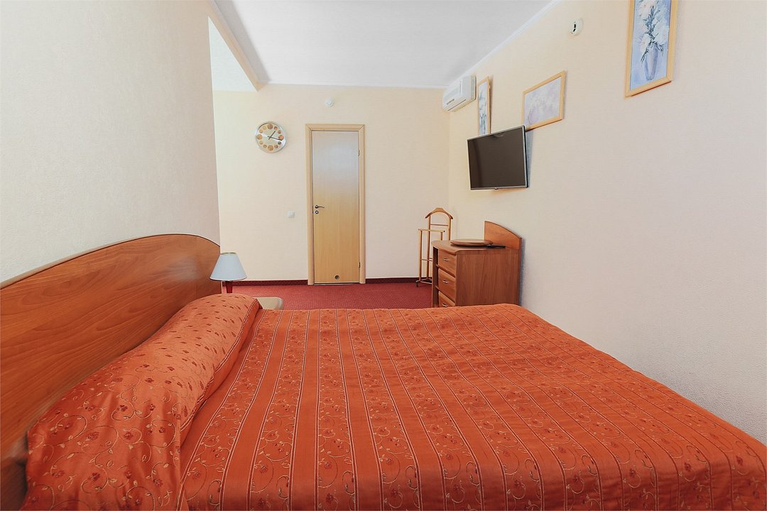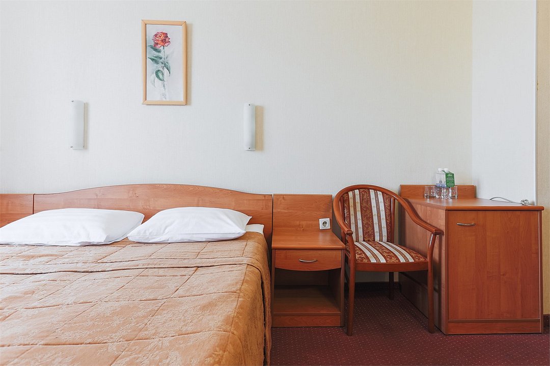 Уютная комната с одной двуспальной кроватью. Спутниковое/цифровое эфирное телевидение, общая система кондиционирования воздуха. Прямая междугородная и международная телефонная связь, доступ к Интернет. Фен, тапочки, набор парфюмерии, халат. Для всех проживающих бесплатно предлагается завтрак «шведский стол» в ресторане IL Gusto, неограниченный доступ к WiFi Интернет, 1 бутылка минеральной воды при заезде, пользование сейфом на рисепшен, свежая пресса, услуги камеры хранения.Услуги и удобства