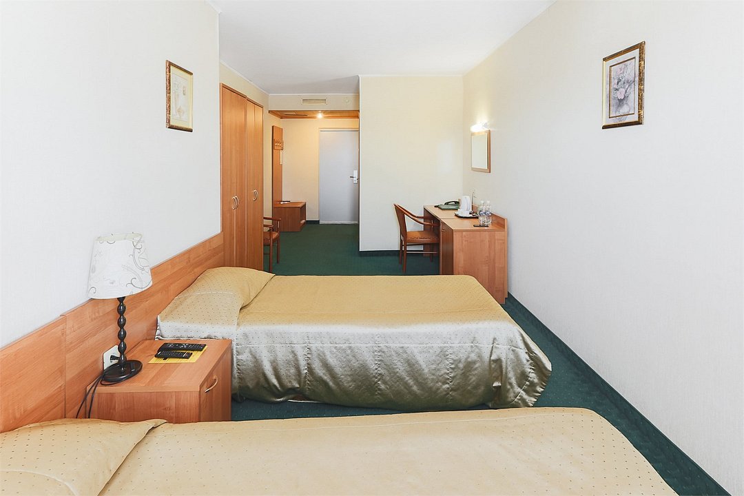 Уютная комната с двумя односпальными кроватями. Спутниковое/цифровое эфирное телевидение, общая система кондиционирования воздуха. Прямая междугородная и международная телефонная связь, доступ к Интернет. Фен, тапочки, набор парфюмерии, халат. Для всех проживающих бесплатно предлагается: завтрак «шведский стол» в ресторане IL Gusto, неограниченный доступ к WiFi Интернет, 1 бутылка минеральной воды при заезде, пользование сейфом на стойке регистрации, свежая пресса, услуги камеры хранения.Услуги и удобства