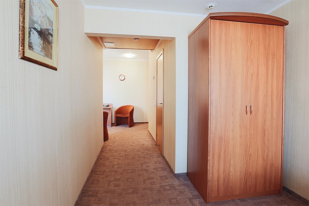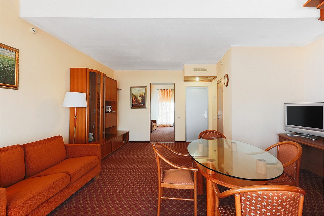 Двухкомнатный комфортный номер: гостиная и спальня. Спутниковое телевидение, фен, общая системы кондиционирования воздуха. Прямая междугородная и международная телефонная связь, доступ к Интернет. Халат, тапочки, фен, элитная серия парфюмерии. Для всех проживающих бесплатно предлагается завтрак «шведский стол» в ресторане IL Gusto, неограниченный доступ к WiFi Интернет, 2 бутылки минеральной воды при заезде, пользование сейфом на стойке регистрации, свежая пресса, услуги камеры хранения.Услуги и удобства