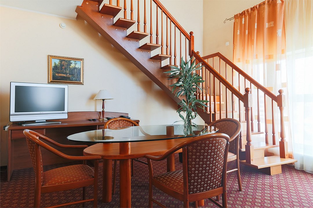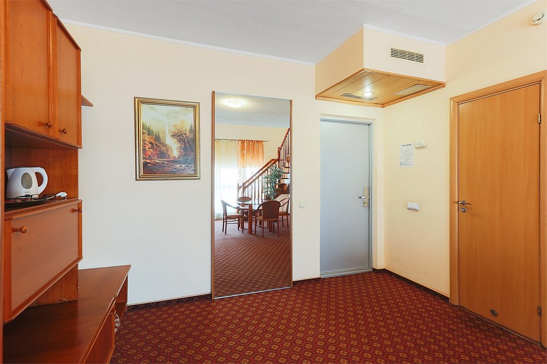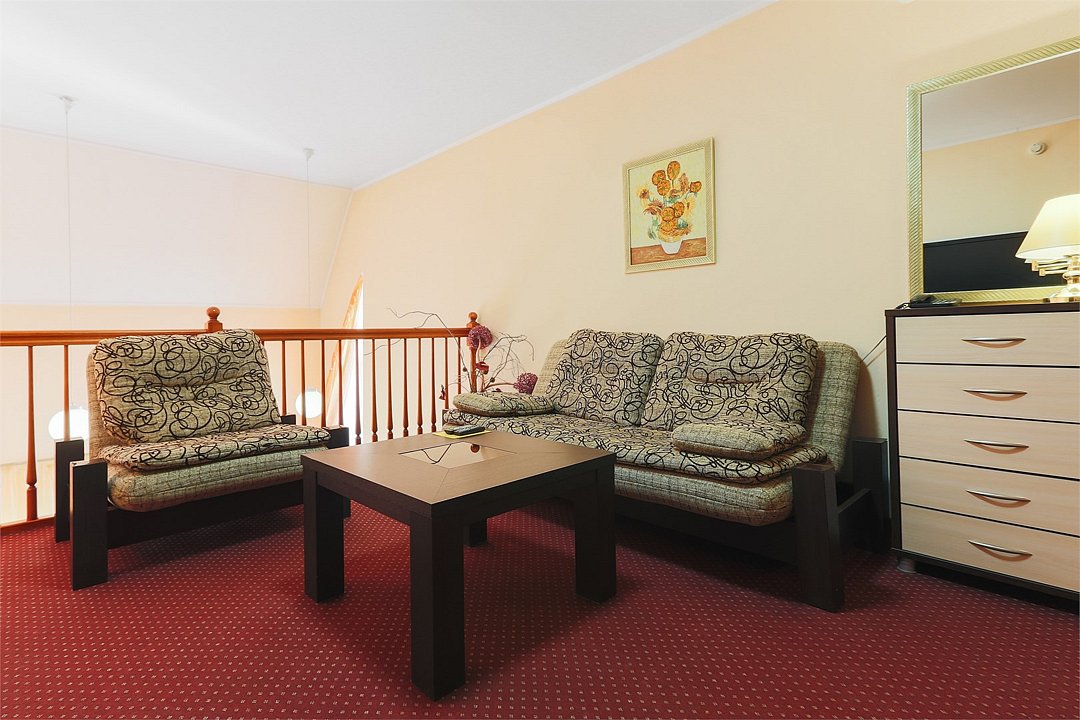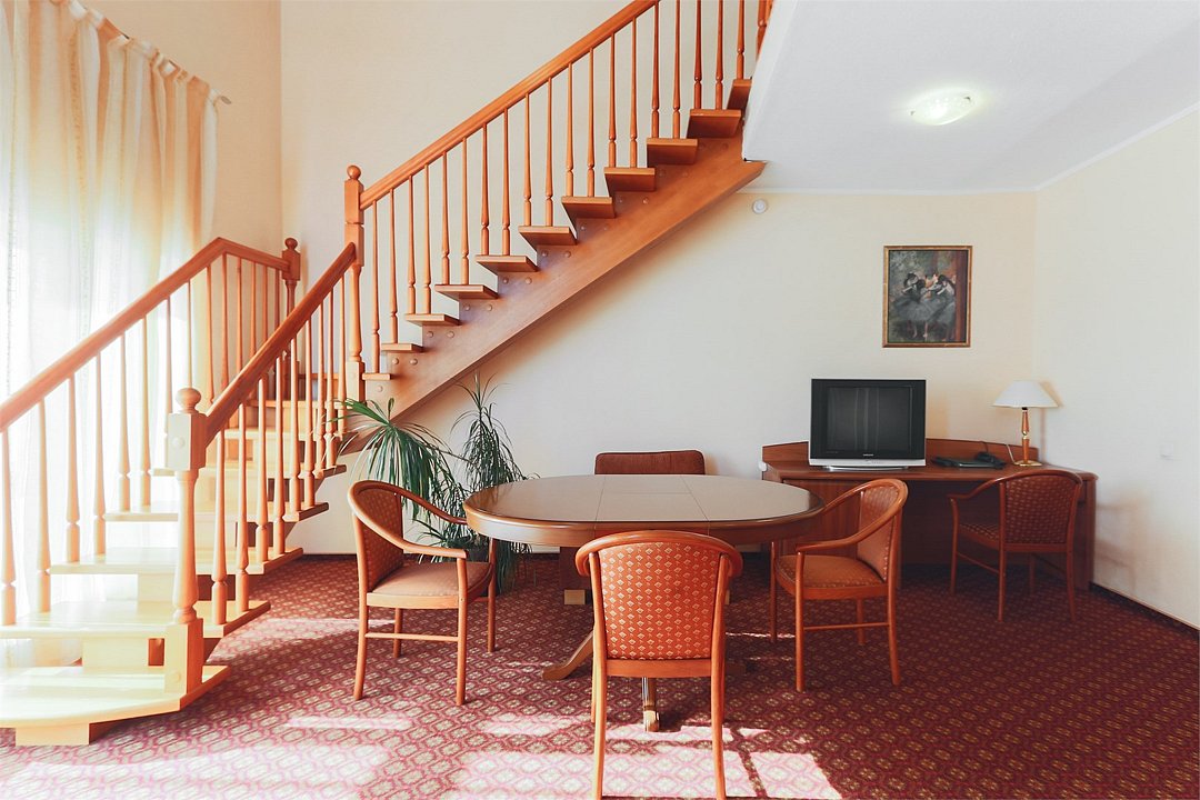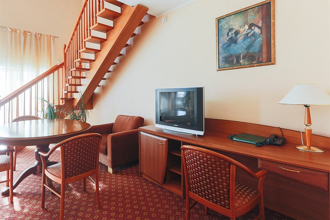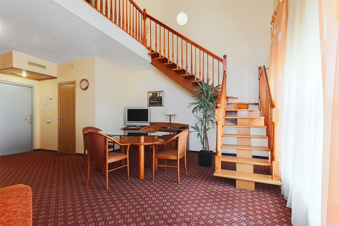 Двухуровневый номер. На первом уровне располагается гостиная, на втором – спальная комната. Санузлы на обоих этажах. Ванная комната. Прямая междугородная и международная телефонная связь, доступ к Интернет. Для всех проживающих бесплатно предлагается завтрак «шведский стол» на двоих в ресторане IL Gusto, неограниченный доступ к WiFi Интернет, пользование сейфом в номере, 3 бутылки минеральной воды при заезде, свежая пресса, услуги камеры хранения.Услуги и удобства