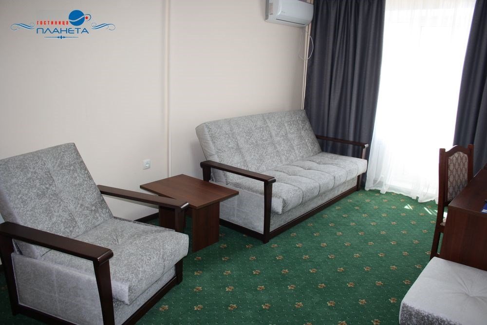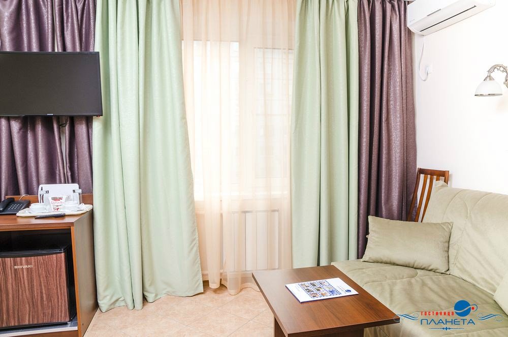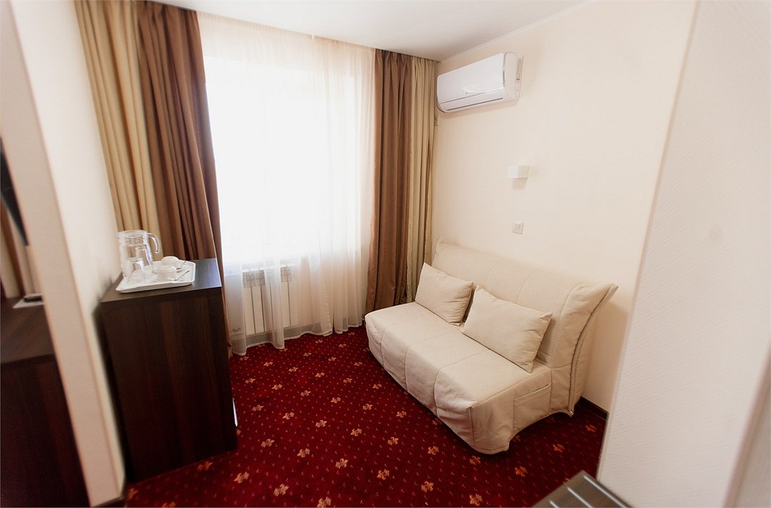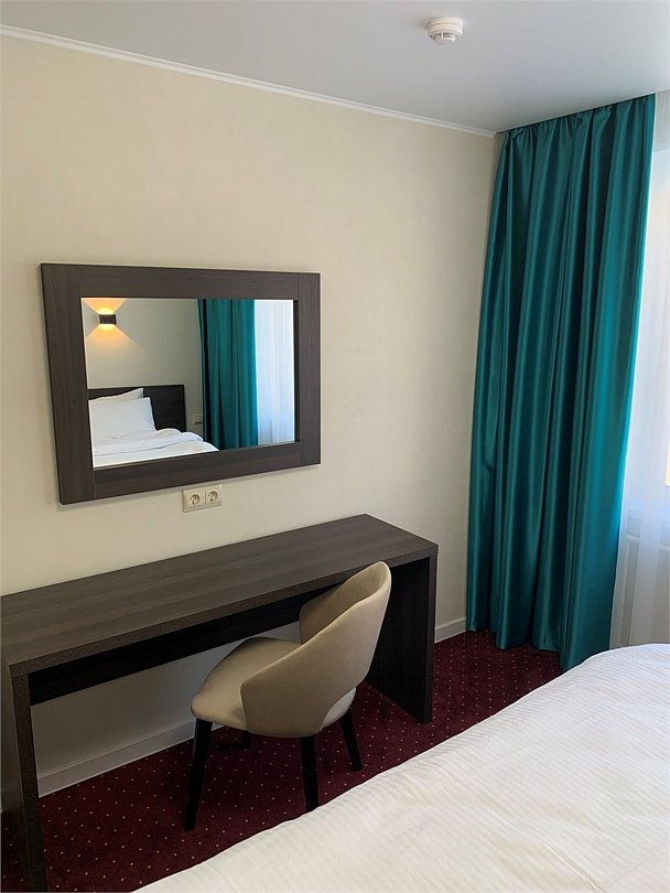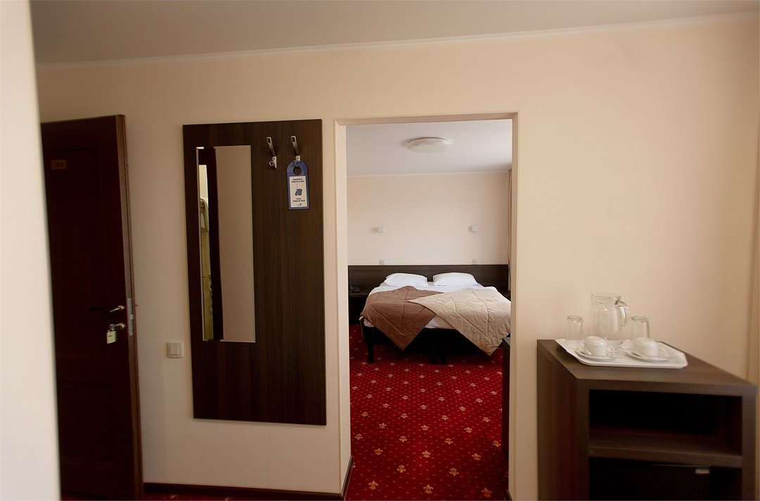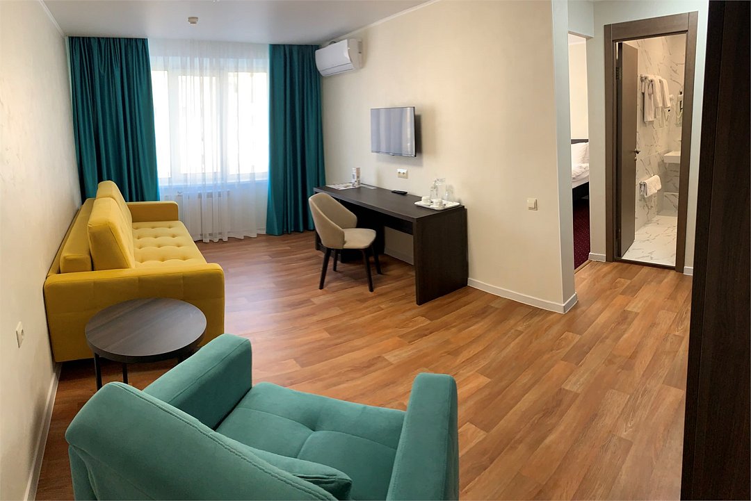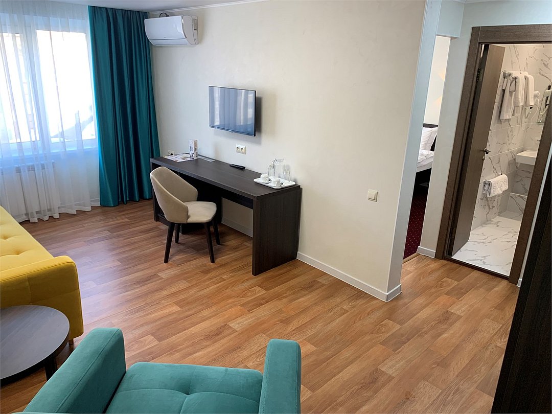 Комфортный двухкомнатный номер высшей категории расположен в новом корпусе гостиницы имеет улучшенную шумоизоляцию. Площадь 32 м2. В гостиной зона отдыха с телевизором, рабочая зона, шкаф, сейф, халаты, тапочки, мини-бар, чай, кофе, чайные принадлежности, электрический чайник. В спальне двуспальная кровать 160*200. Ванная комната с душем, феном и расширенным набором парфюмерии.Услуги и удобства