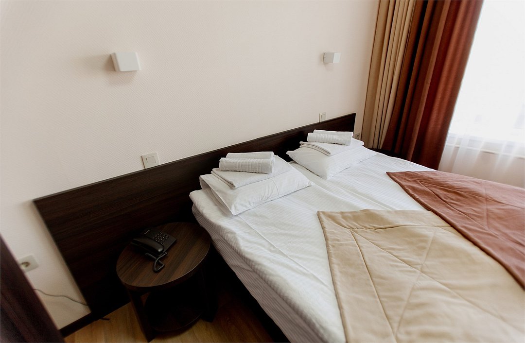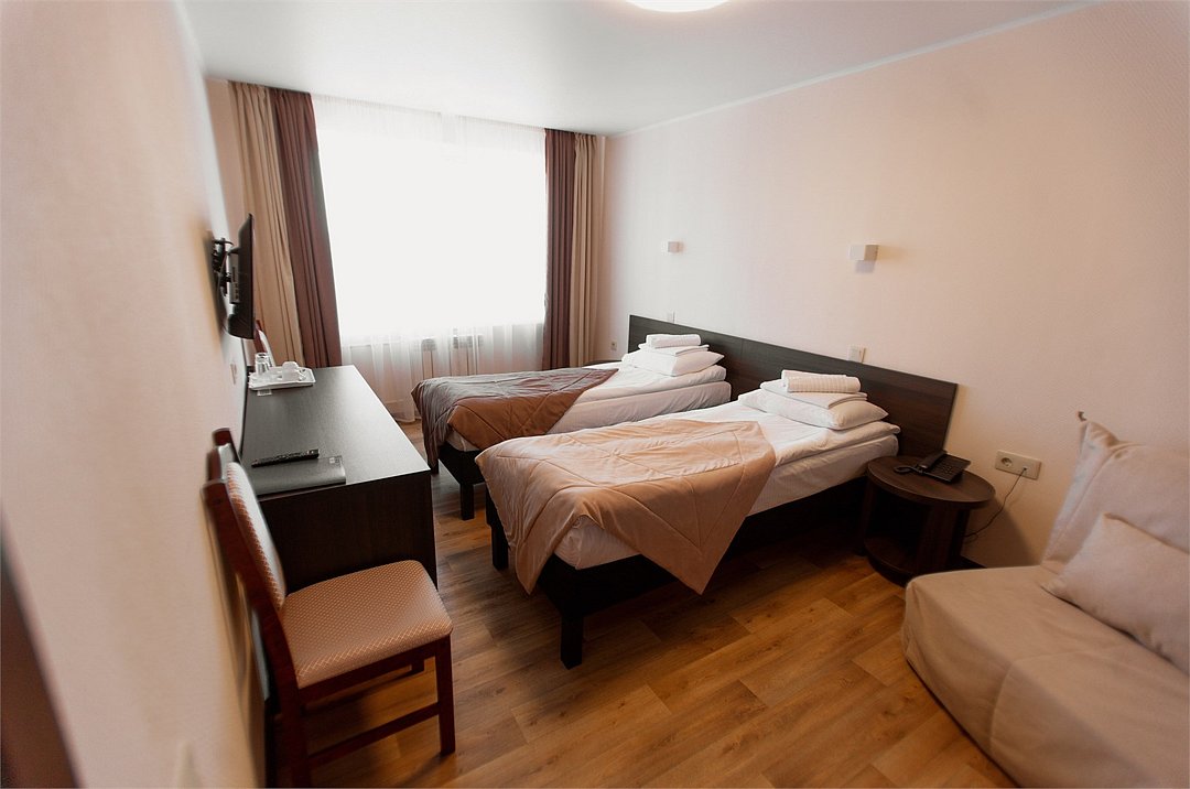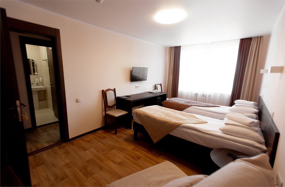 Номер I-ой категории общей площадью 25 м2. В номере: ванная комната с душем, двуспальная кровать (трансформер) 160*200/ 90*200+90*200, зона отдыха, шкаф, рабочая зона, телевизор, холодильник, кондиционер, фен, набор полотенец , туалетная парфюмерия, чайные принадлежности. *Халаты, тапочки, зубные и бритвенные наборы предоставляются по просьбе.Услуги и удобства