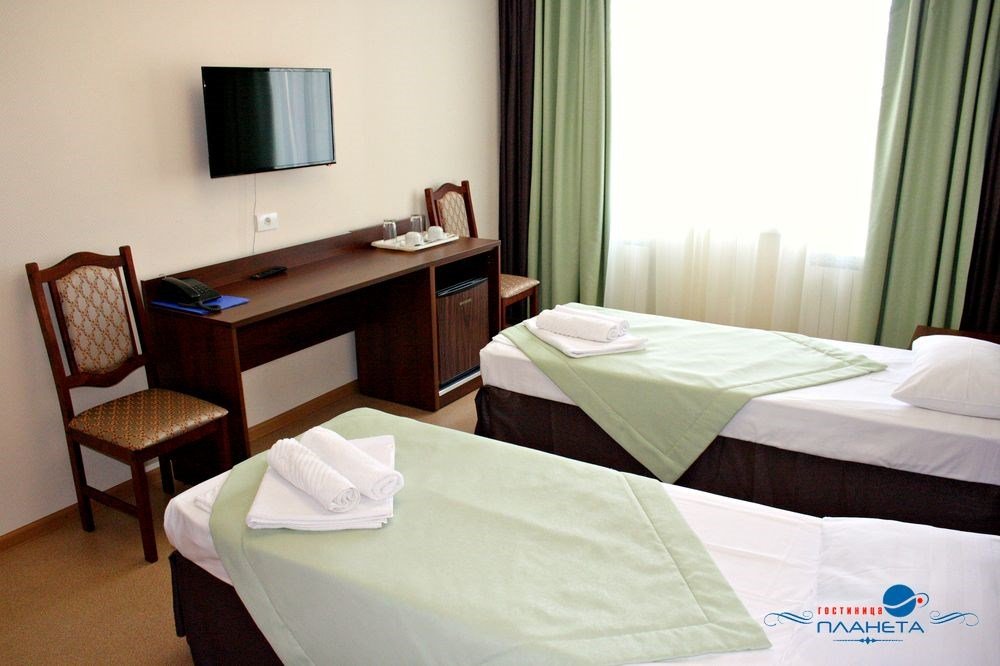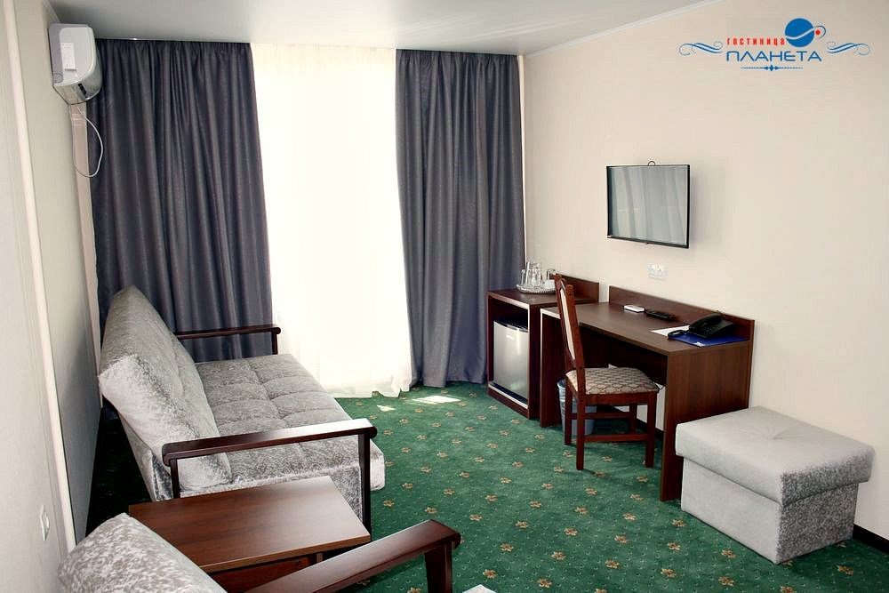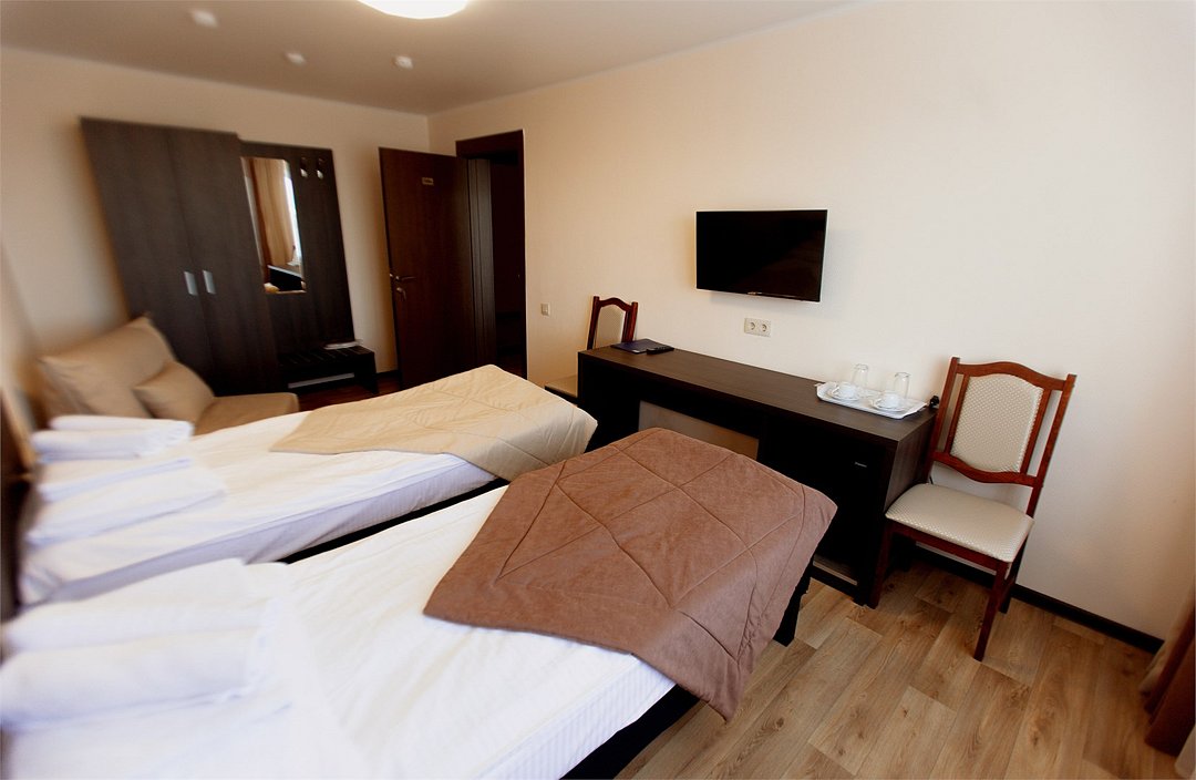телевизор, кабельное телевидение, Wi-Fi, телефон, холодильник, светильник, обогреватель, водонагреватель, халаты, банные полотенца, тапочки, гигиенические средства, две односпальные или большая двуспальная кровать, тумбы, стулья, шкаф для одежды, вешалки, журнальный столик, письменный стол, багажная тумба, зеркало, две комнаты, сейф, минеральная вода, унитаз, раковина, ковровое покрытие, душ, вид на город, кулер на этаже, вид во двор, раскладной диван, мини-холодильник, гостиничная парфюмерия, можно с питомцамиВ номере