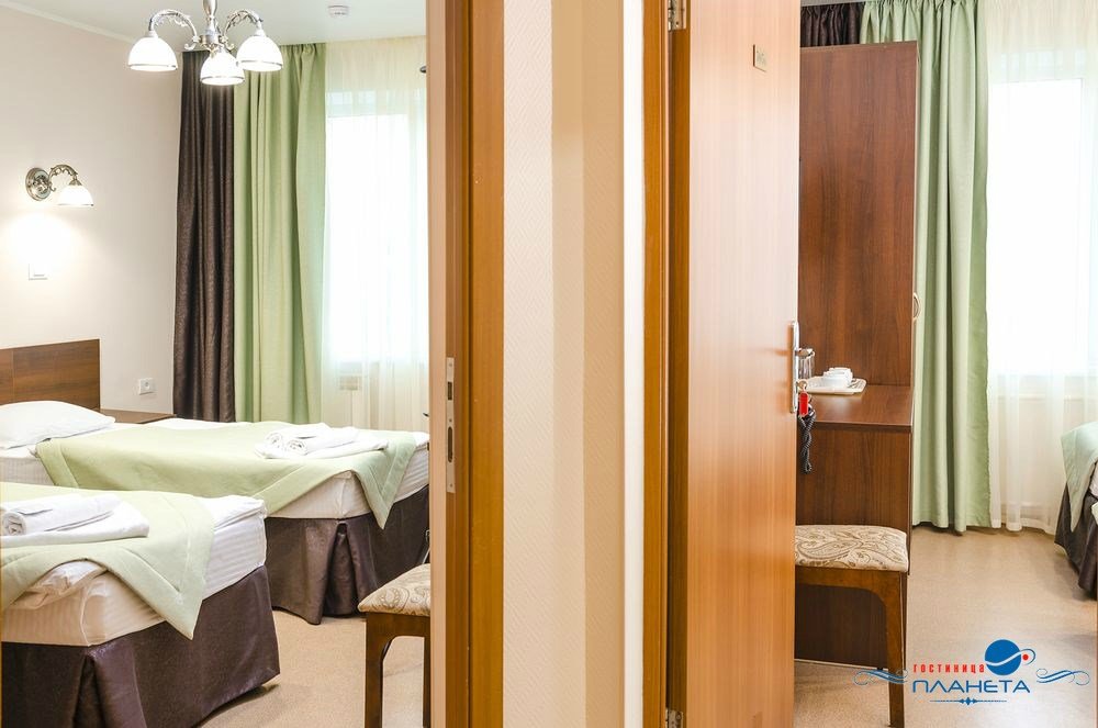 Семейный номер I-ой категории для семьи из 3х или 4х человек, общая площадь номера 32.4 кв.м. В номере две отдельные спальни с двуспальной кроватью трансформер и двумя односпальными кроватями, ванная комната с душем. В номере холодильник, телевизор, шкаф для одежды, стол, стулья, по 3 полотенца для каждого гостя, мыло и шампунь в диспенсерах. *Халаты, тапочки, зубные и бритвенные наборы предоставляются по просьбе.Услуги и удобства