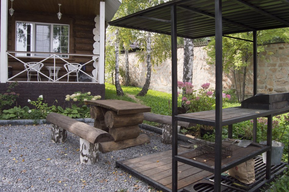 Рядом с домом установлен мангал. Есть шампура, казан и столовые приборы.