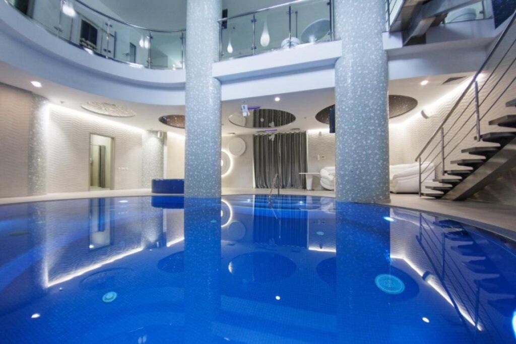 - 1 этаж: теплый бассейн, водная горка, финская сауна, хаммам и соляная парная, джакузи, купель;