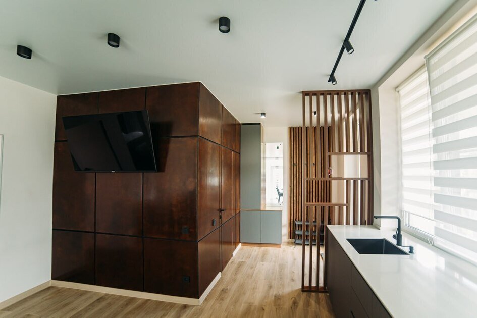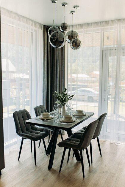 В доме просторная гостиная с кухонной зоной, две спальни, ванная комната. У каждого дома большая терраса с уличной мебелью, а так же индивидуальная купель.