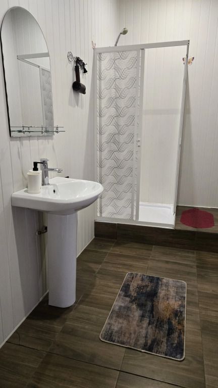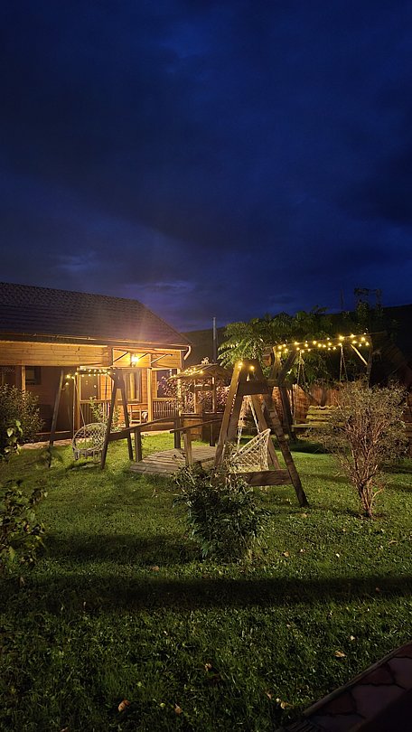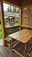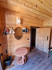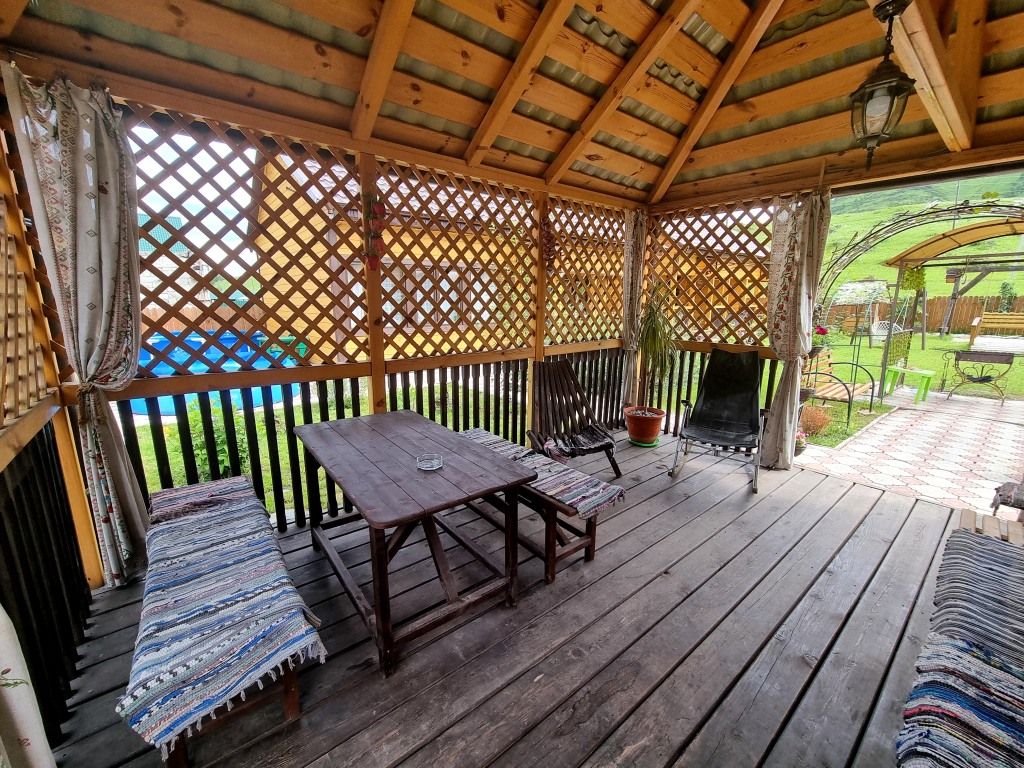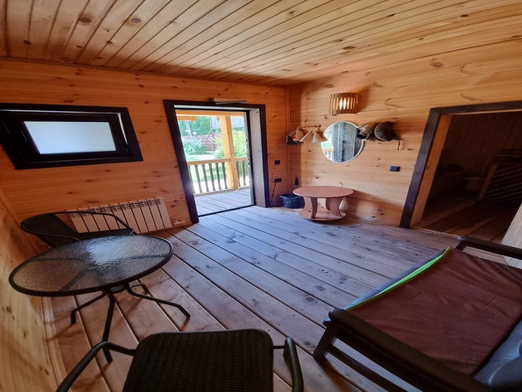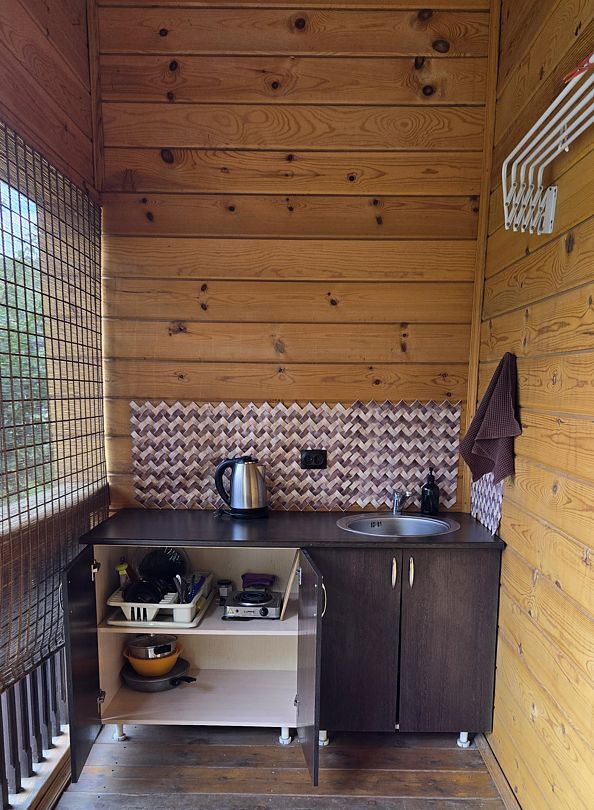 В доме есть большая комната с двуспальной кроватей и диваном, ванная комната с душем, открытая веранда с мини кухней, телевизор, чайник, микроволновка, плита и прочие удобства.