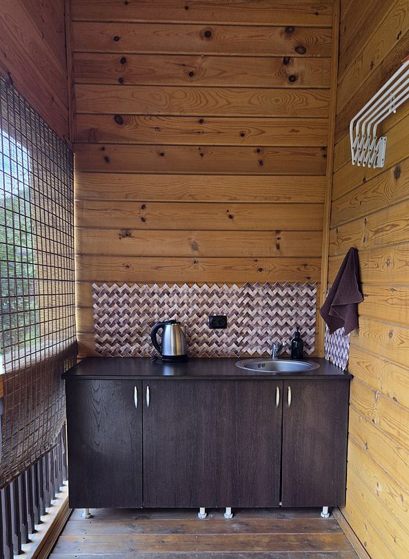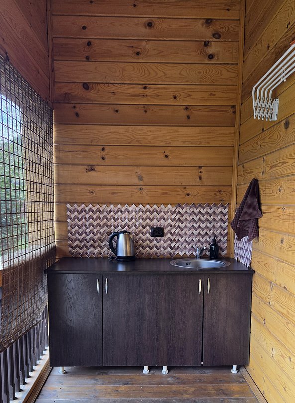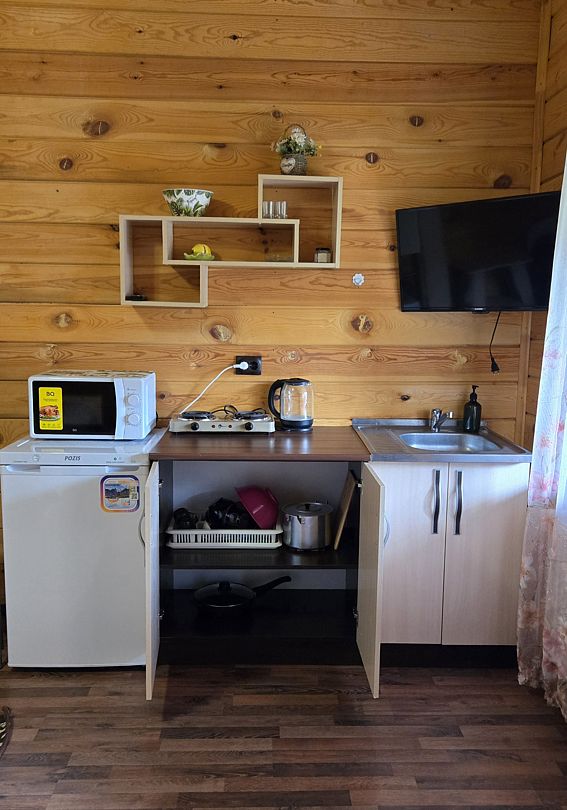 На территории базы вас будут ждать 4 уютных отдельно стоящих домика и 2 домика под одной крышей. Каждый дом оснащен просторной комнатой с двуспальной кроватью и диваном, ванной комнатой с душем, а также открытой верандой с мини-кухней. В номере имеются телевизор, чайник, микроволновая печь, плита и прочие удобства.