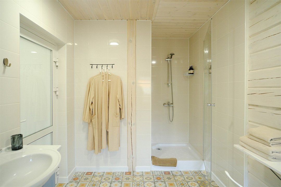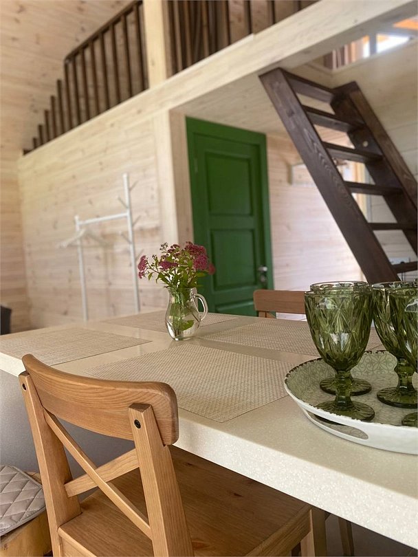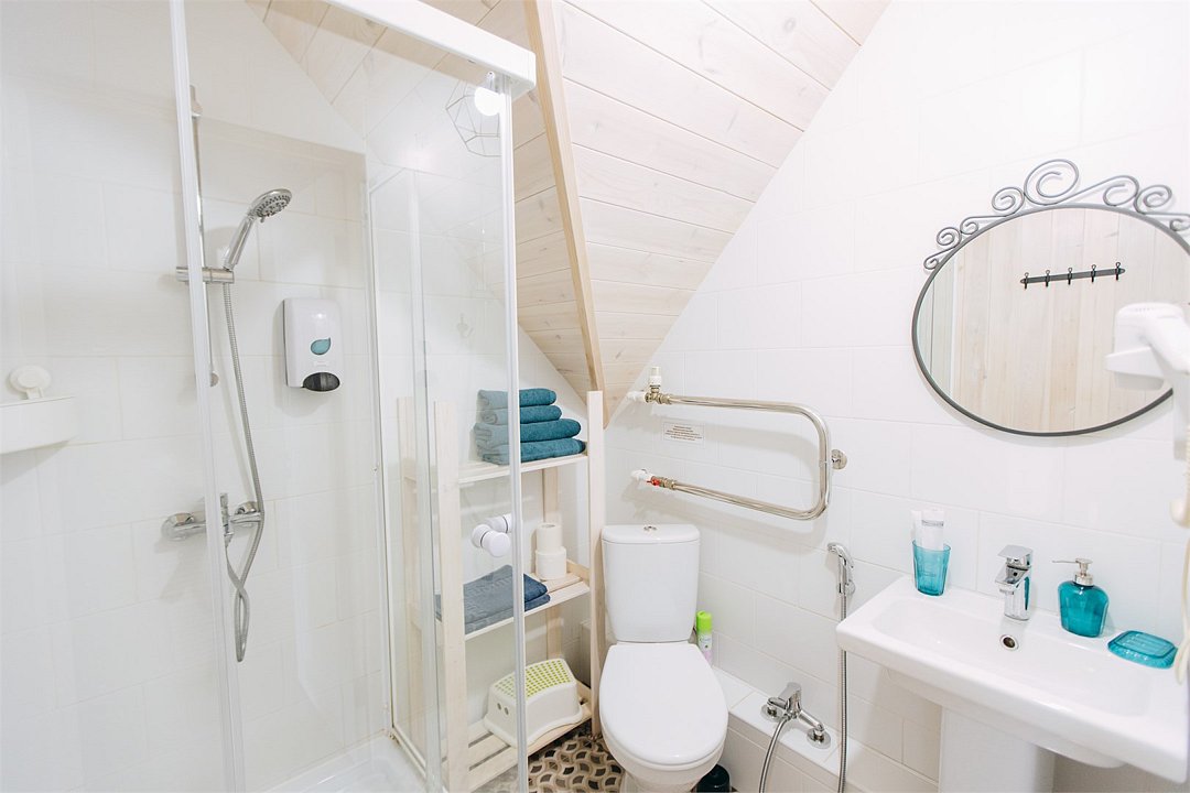 ✔ Отдельный дом с 2 спальнями и кухней - гостиной ✔ Размещение на 2 двухместных кроватях с возможностью разделения на одноместные (система боксспринг), раскладной диван в зале ✔ Кухонная зона представлена гарнитуром с холодильником, чайником, микроволновой печью, посудомоечной машиной и набором посуды, стол, 6 стульев ✔ Ванная комната на 1 этаже оснащена всем необходимым (душ, гигиенический душ, набор полотенец, фен, халаты, туалетные принадлежности и косметика), на 2 этаже раковина и туалет ✔ Теплый пол, кондиционер ✔ Собственная терраса с мебелью, качелей и мангалом ✔ Парковочное место у домаУслуги и удобства