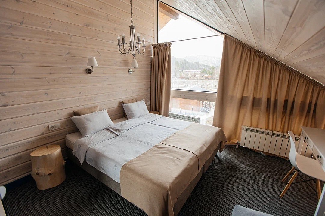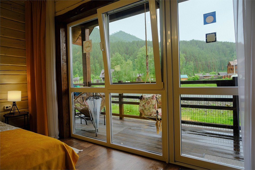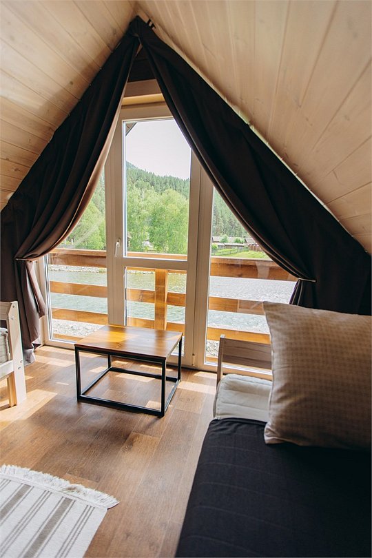 ✔ Просторный номер в общем гостевом доме с панорамным окном и видом на горы, реку ✔ Большая терраса с качелей и мебелью для отдыха ✔ Просторная ванная комната, оснащенная всем необходимым (душ, гигиенический душ, набор полотенец, фен, халаты, туалетные принадлежности и косметика) ✔ Кухонная зона с холодильником, чайником, микроволновой печью и набором посуды ✔ Зона для приема пищи, диван, гардеробная ✔ Номер находится в непосредственной близости к реке, собственный вход, в удалении от остальных гостей, не проходнойУслуги и удобства