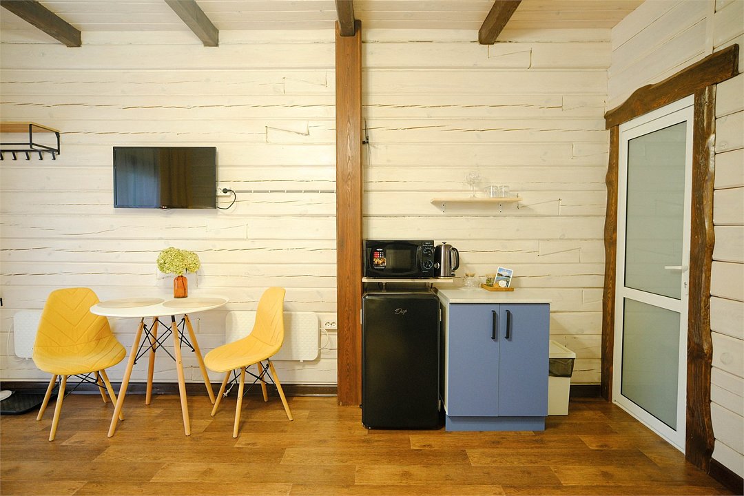 ✔ Просторный стандартный номер с балконом ✔ Расположен на втором этаже основного гостевого дома ✔ Кухонная зона представлена барной стойкой с видом на реку, холодильником, чайником, набором посуды, 2 стула ✔ Ванная комната оснащена всем необходимым (душ, гигиенический душ, набор полотенец, фен, халаты, туалетные принадлежности и косметика) ✔ Балкон с мебельюУслуги и удобства