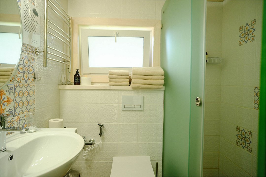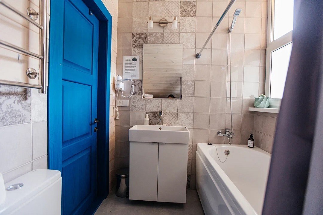 ✔ Отдельный дом с 2 спальнями и кухней - гостиной ✔ Размещение на 2 двухместных кроватях с возможностью разделения на одноместные (система боксспринг), раскладной диван в зале ✔ Кухонная зона представлена гарнитуром с холодильником, чайником, микроволновой печью и набором посуды, стол, 6 стульев ✔ Ванная комната оснащена всем необходимым (душ, гигиенический душ, набор полотенец, фен, халаты, туалетные принадлежности и косметика) ✔ Теплый пол, кондиционер ✔ Собственная терраса с мебелью, качелей и мангалом ✔ Парковочное место у домаУслуги и удобства