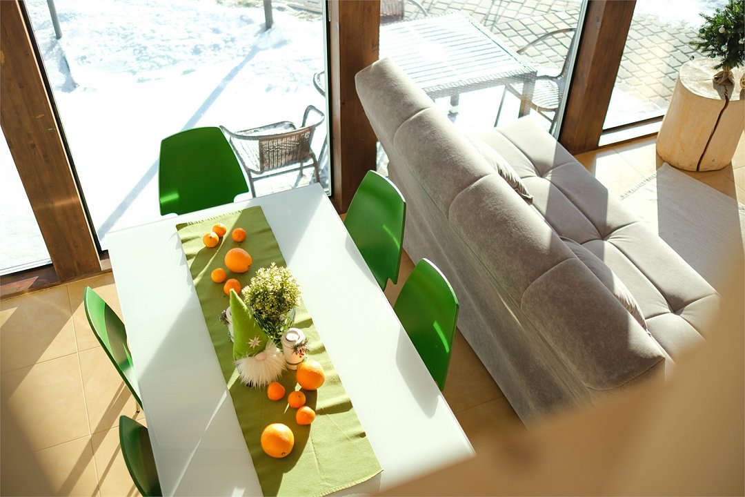 ✔ Просторный номер в общем гостевом доме с панорамным окном и видом на горы, реку, бассейн ✔ Большая терраса с качелей и мебелью для отдыха ✔ Ванная комната, оснащенная всем необходимым (душ, набор полотенец, фен, халаты, туалетные принадлежности и косметика) ✔ Кухонная зона с мебельным гарнитуром, раковиной, холодильником, чайником, микроволновой печью и набором посуды ✔ Зона для приема пищи, диван ✔ Зона спальни и общей гостиной разделена шторойУслуги и удобства