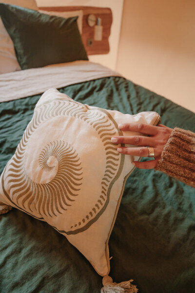 - белоснежное постельное белье и авторский текстиль ручной работы;