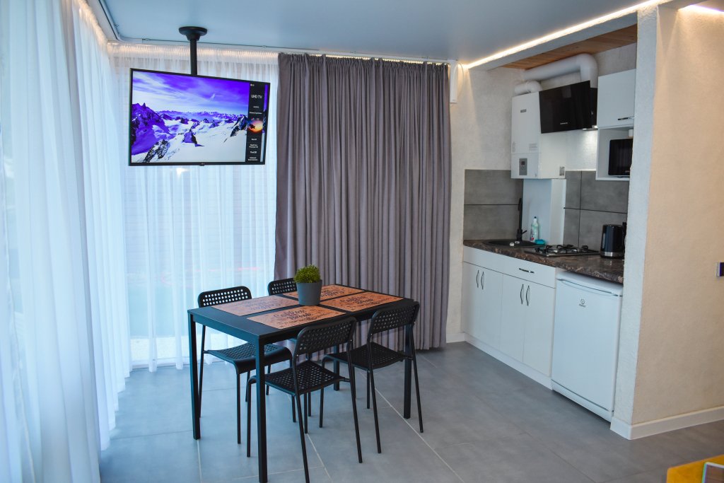 В распоряжении гостей система автоматизации Smart House, стиль хайтек, кухня с необходимыми приспособлениями, чайником, холодильником и микроволновой печью.